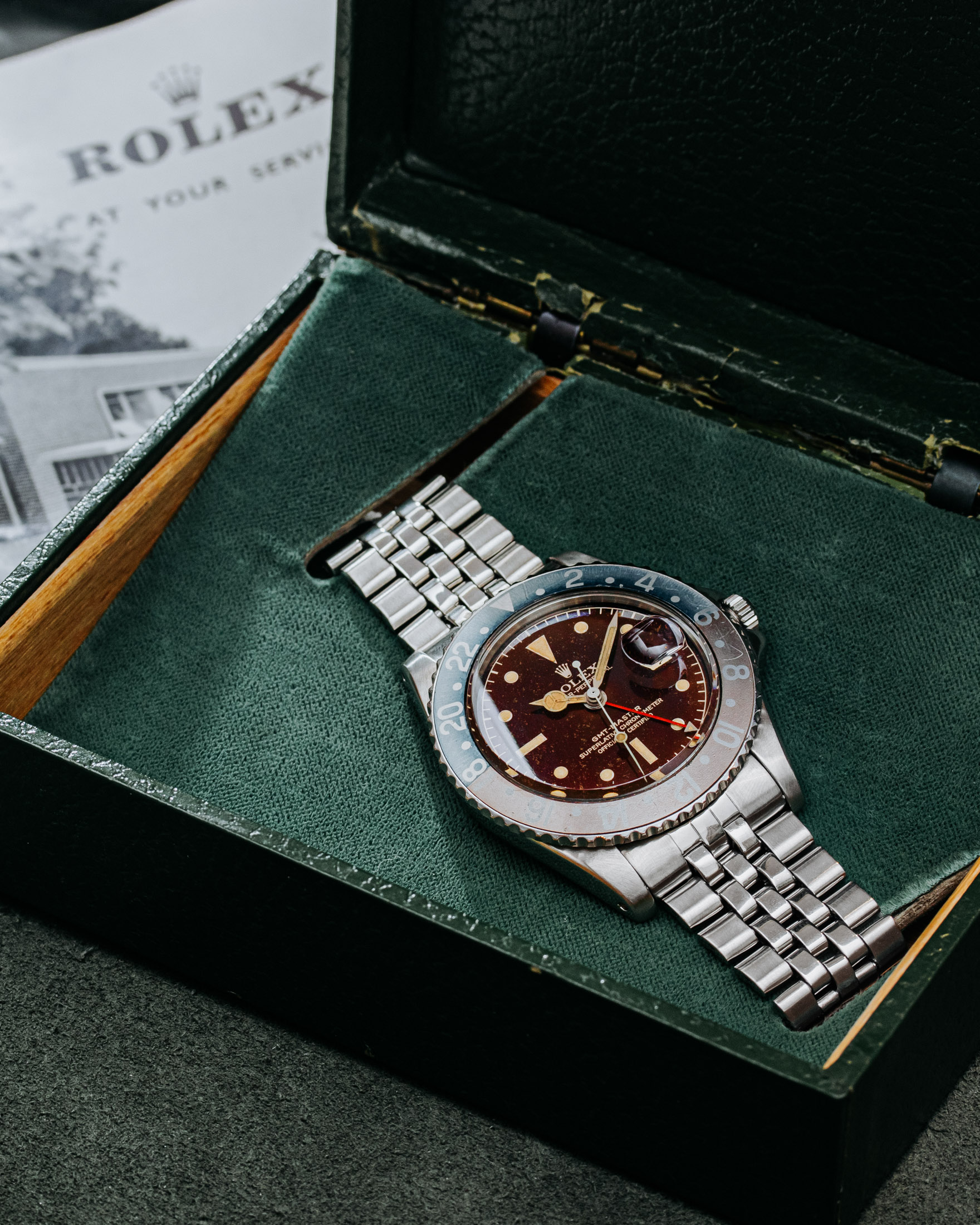 1960 GMT-Master 1675: tropical gilt, Pepsi fade, full set. Provenance meets patina.