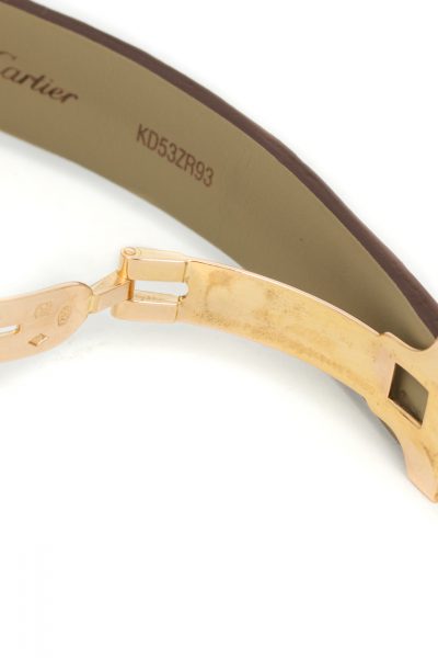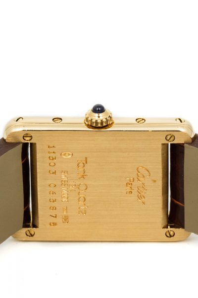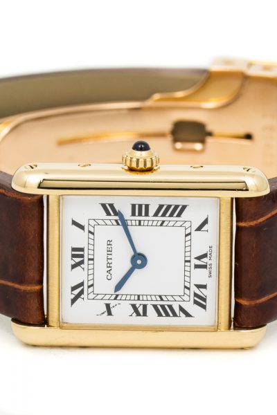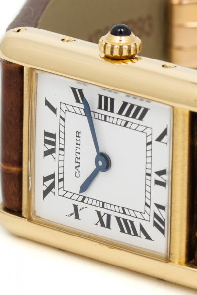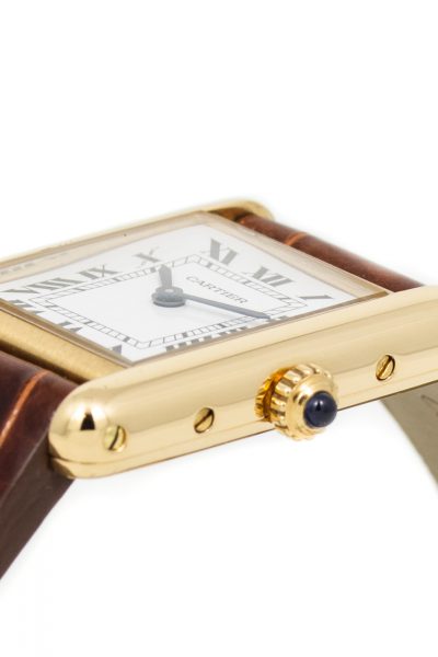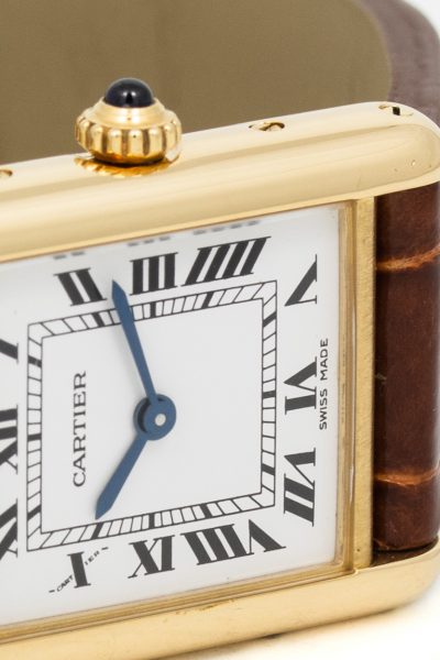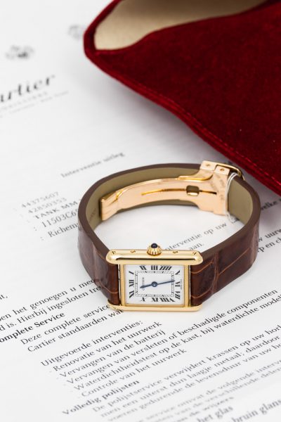 The iconic design looks simple and elegant, but is deceptively complex at the same time. The nearly square case is flanked by two brancards, giving the watch its slender, rectangular appearance. A form that is clearly taken from the Renault tank with its tracks. A white dial, black Roman numerals, heat-blued hands, rail-road track and sapphire cabochon crown complete the typical Tank design.