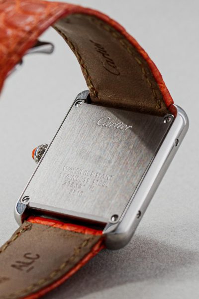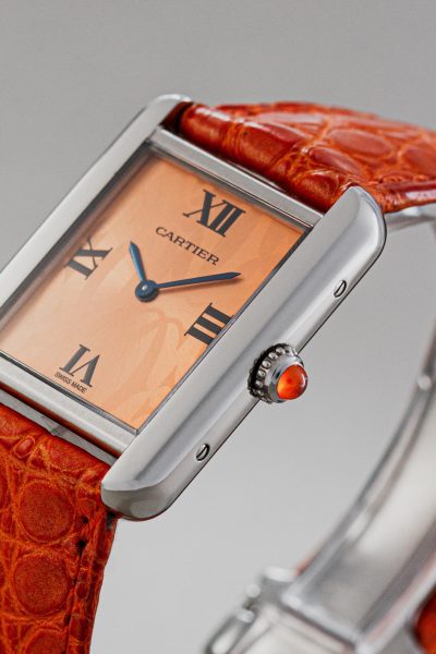 A unique orange cabochon crown complements the design, adding an extra layer of cohesion and refinement. Powered by a reliable quartz movement, this Swiss-made timepiece ensures accurate timekeeping while showcasing Cartier’s hallmark craftsmanship.