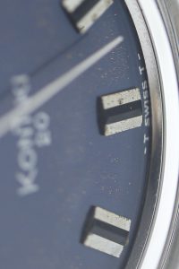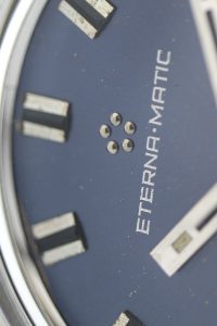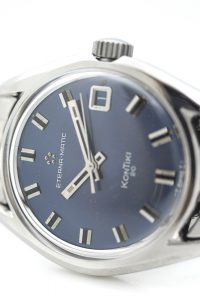This Eterna-Matic comes from 1970 and has an original Eterna bracelet, the ” Guy Freres”, a caseback bearing the gold icon of the Kon-Tiki itself, a stunning original blue dial and baton hands.