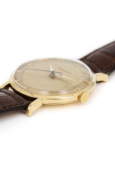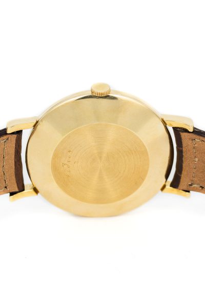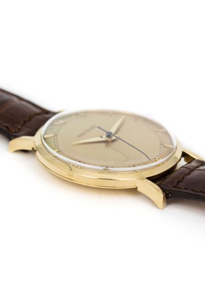 This beauty dates back to just after WWII, a period when wristwatches underwent major technical improvement and innovation. But this is far from a milspec watch. This is a dress watch in 18k yellow gold.