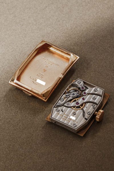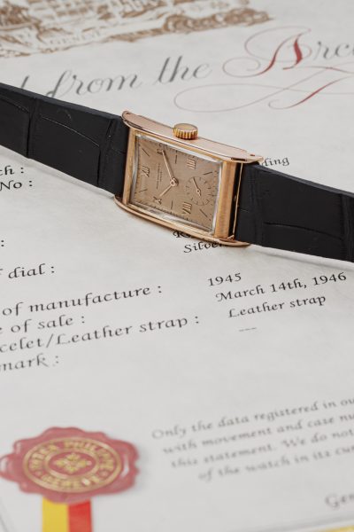 Crafted by Patek Philippe, this exquisite watch features a solid rose gold case and a sleek design that embodies the essence of Art Deco elegance. Its warm rose gold dial, originally a light rose hue, now bears the marks of time, reminiscent of the journeys it has witnessed.