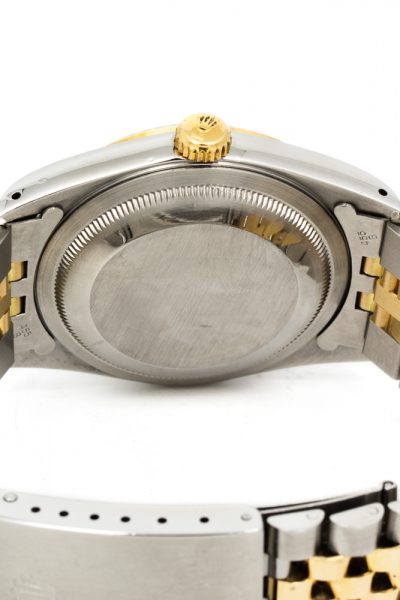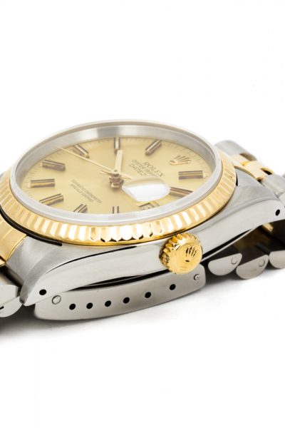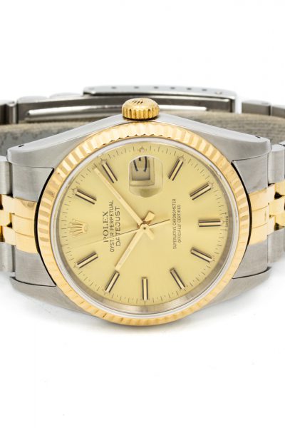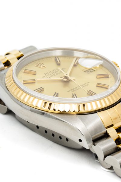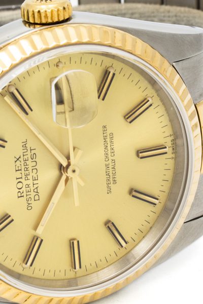Golden Sunshine, that is what came to mind when we saw this two-tone Rolex Datejust ref. 16233 for the first time. The combination of the gold and steel with the champagne sunburst dial on this bicolor Rolex is simply stunning. The condition of the watch is impeccable.