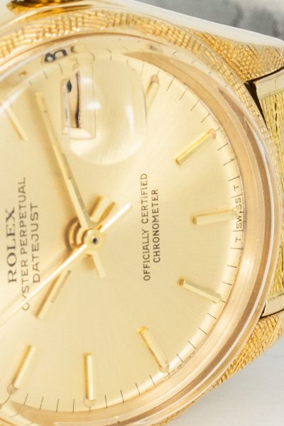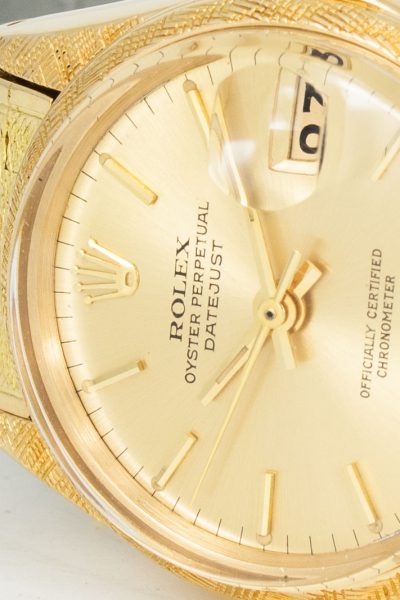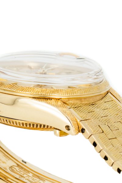 This is a Ref. 6520 from ca. 1966 in 18k yellow gold. While we are used to seeing fluted, smooth and engine-turned bezels, this is something else entirely: a Florentine finish. And it is not limited to the bezel. The lugs and the entire 18k yellow gold bracelet (original, also from 1966) are covered in the uniquely fine texture.