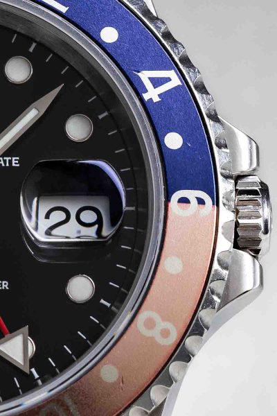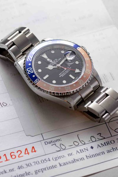 Rolex fitted the GMT Master with a bakelite bezel insert, displaying 24 hours. A, now iconic, color-scheme of blue for the night and red for the day was introduced. The Pepsi Rolex was born. Since bakelite was prone to breaking, an aluminum bezel insert was introduced in 1956.