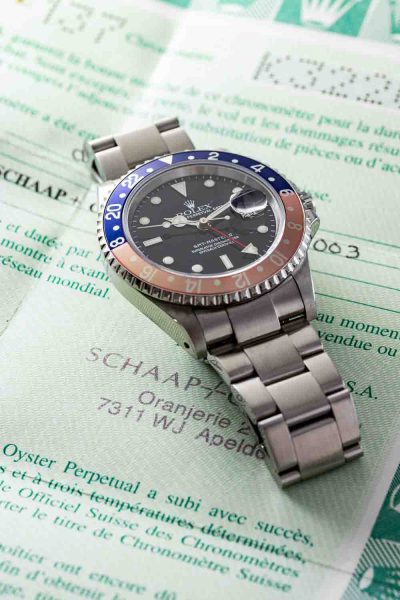 The star of the show here is that faded bezel. While the blue is still quite strong, the red half has faded to a beautiful light red. This is how we love to see a GMT bezel! But also, hold your horses….original box and papers.