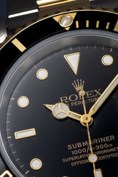 The ref. 16613 was released in 1988 and enjoyed a long production run before being discontinued and replaced in 2009 with the current Cerachrom ceramic bezel 6-digit ref. 116613, marking the end of the aluminum bezel Rolex Submariner two-tone watches.
