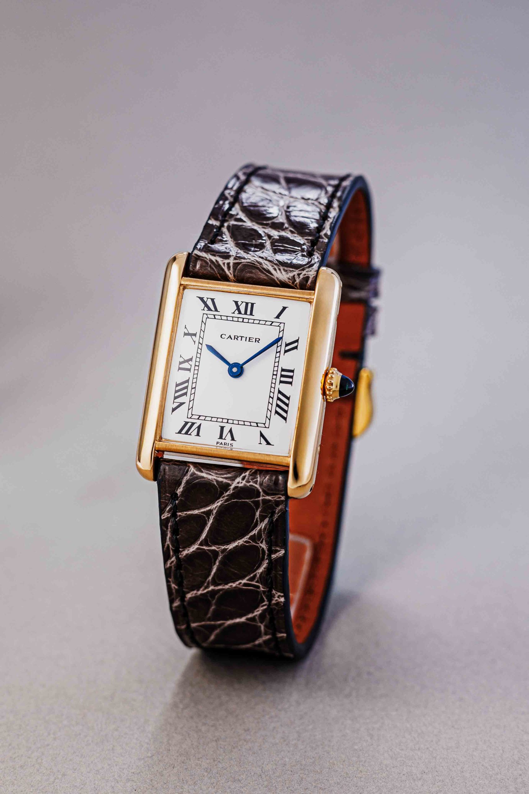 The iconic design looks simple and elegant, but is deceptively complex at the same time. The nearly square case is flanked by two brancards, giving the watch its slender, rectangular appearance. A form that is clearly taken from the Renault tank with its tracks. A white dial, black Roman numerals, heat-blued hands, rail-road track and sapphire cabochon crown complete the typical Tank design.