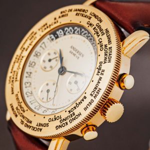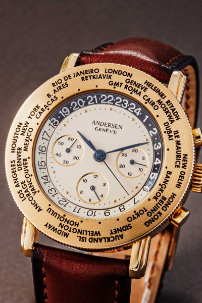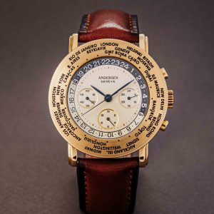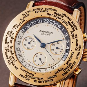 This watch is an early iteration of a world time chronograph by Andersen Genève, produced circa 1990. During this period, Andersen was a true pioneer in independent watchmaking, releasing extraordinary innovations never seen before. This particular piece features both a chronograph and a world time complication, showcasing Andersen Genève’s mastery of world timers crafted in the classical tradition of Louis Cottier, the original inventor of the complication.