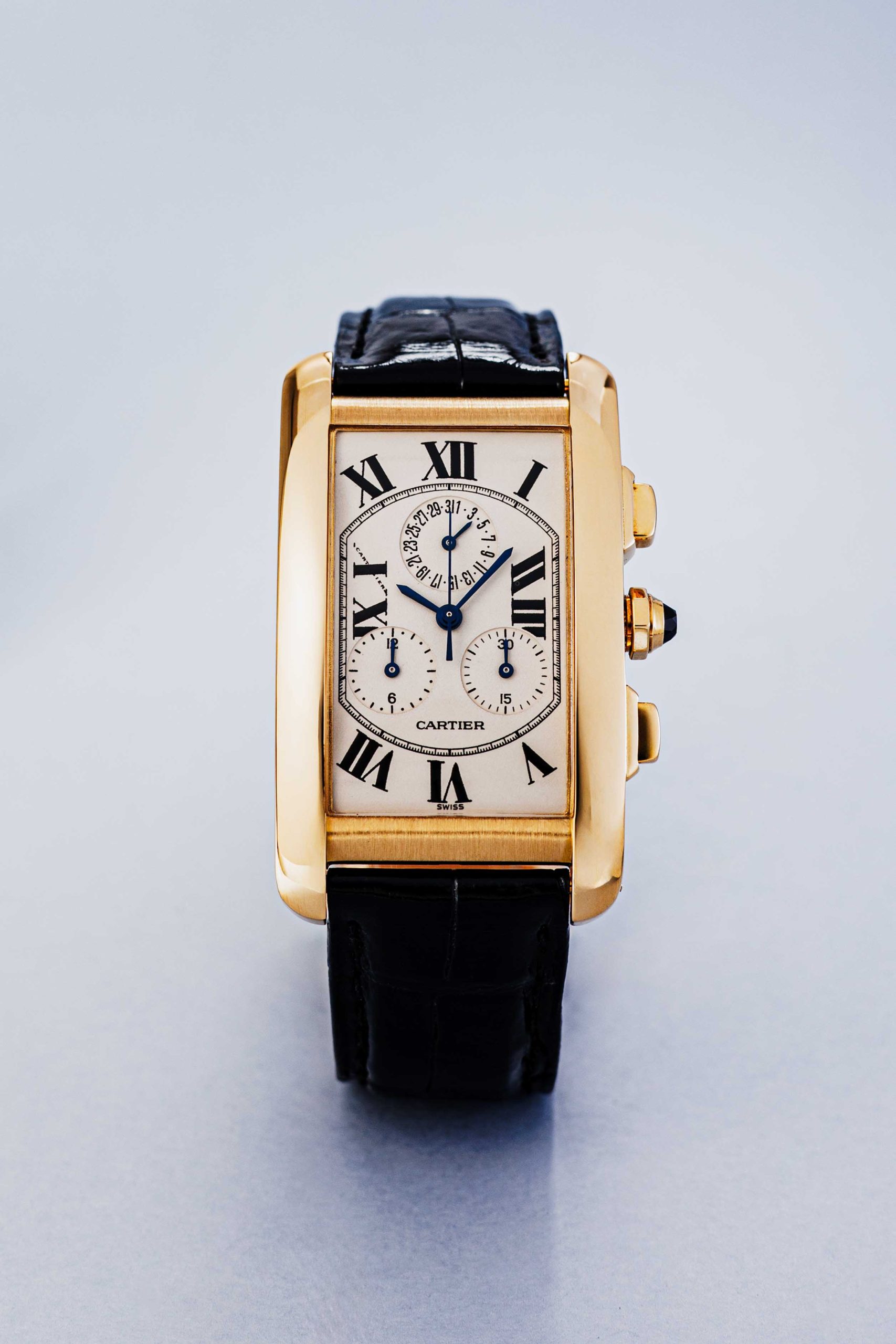 Crafted from solid 18-karat yellow gold, this watch exudes a warmth that only Cartier can capture so masterfully. The case, with its modest yet powerful dimensions of 26 x 36 mm, is protected by a scratch-resistant sapphire crystal. The iconic flanked crown, set with a deep blue sapphire cabochon, is accompanied here by two pushers that operate the chronograph function. The Chronoflex (also called Chronoreflex) is Cartier’s name for their advanced “mecha-quartz” movement, usually caliber 212P.