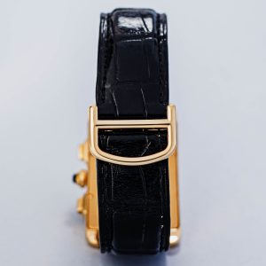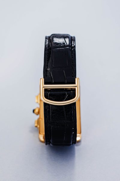 This watch is fitted with a deep black Cartier crocodile leather strap, secured by the renowned 18k gold folding clasp. This clasp not only ensures security but also creates a seamless, luxurious fit on the wrist.