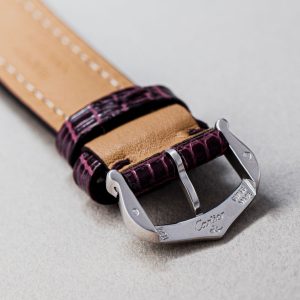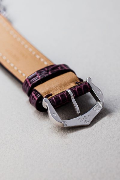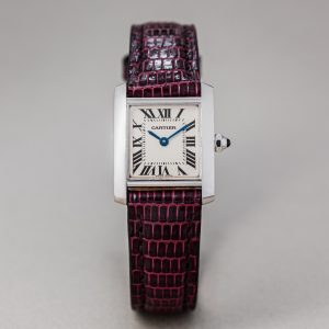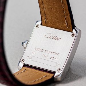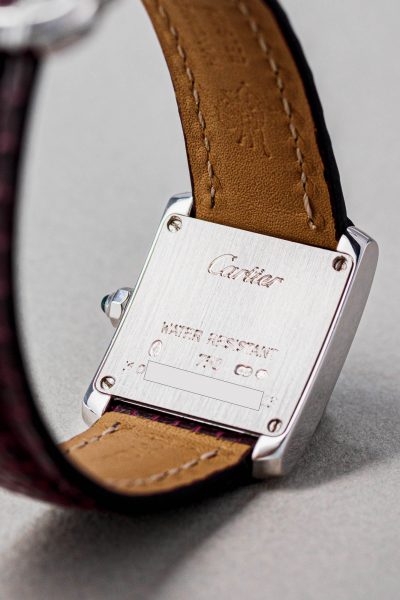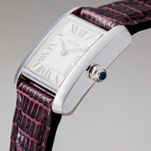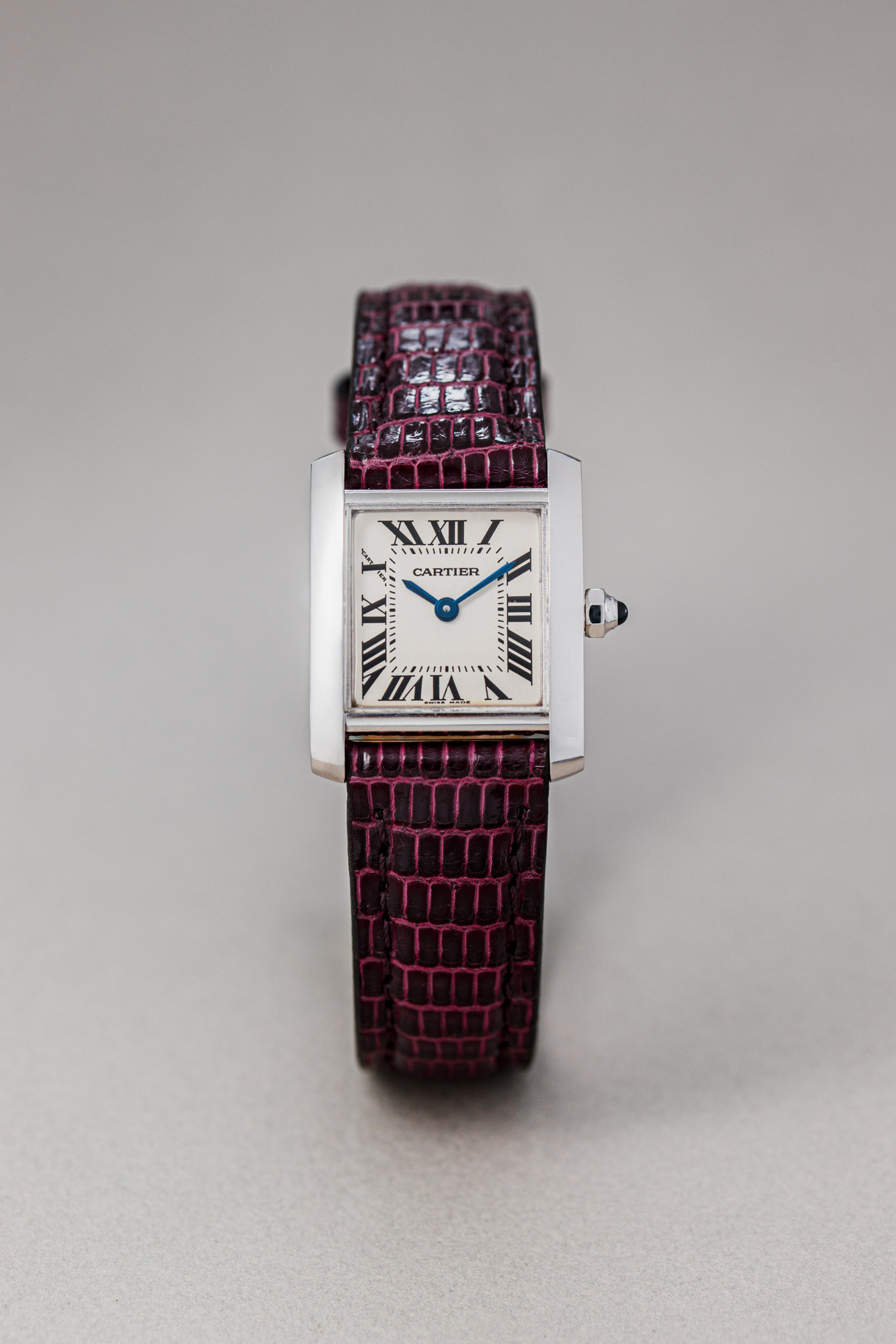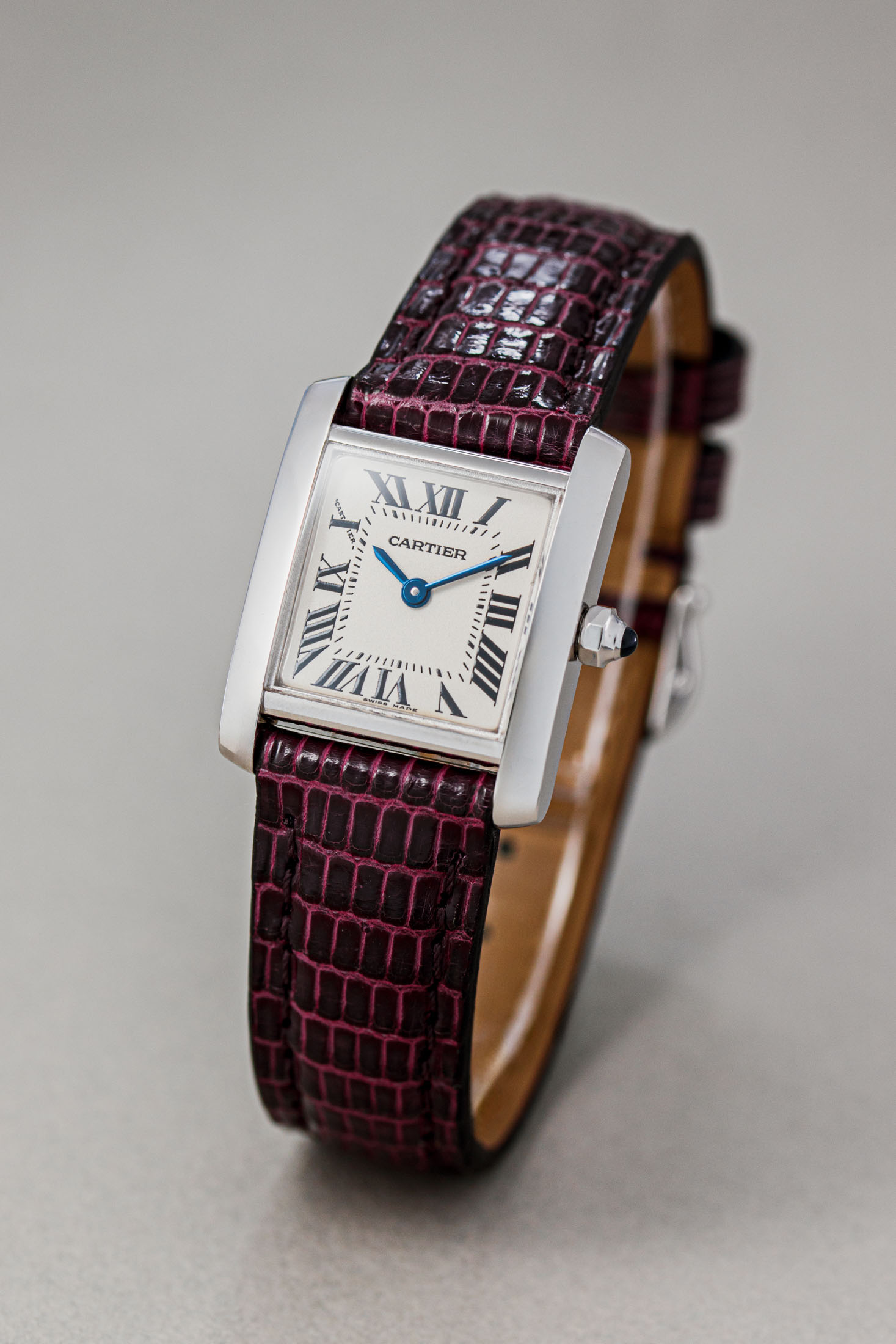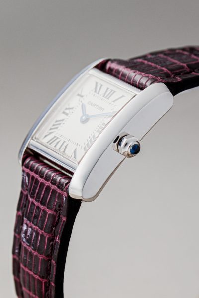 The iconic design looks simple and elegant, but is deceptively complex at the same time. The nearly square case is flanked by two brancards, giving the watch its slender, rectangular appearance. A form that is clearly taken from the Renault tank with its tracks. A white dial, black Roman numerals, heat-blued hands, rail-road track and sapphire cabochon crown complete the typical Tank design.