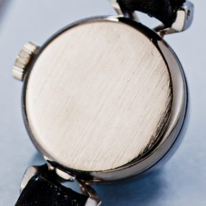 The watch has an extremely compact round case with elegant, fan-shaped lugs and a slim black leather strap, creating a timeless and feminine look.