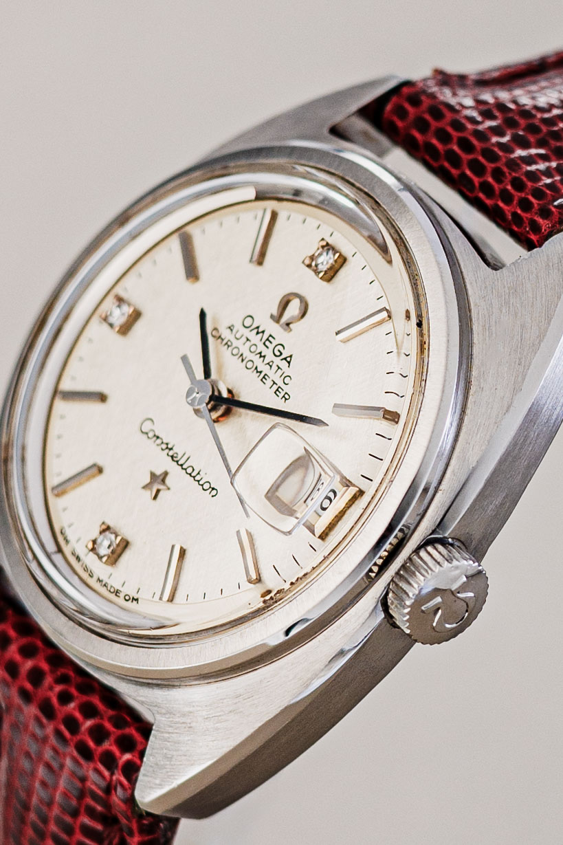 The earlier models from the 1950’s and 1960’s featured the iconic pie-pan dial. The dial would slope down at an angle around its outer perimeter, providing a very cool sense of dimensionality. Since the look is reminiscent of the underside of a pie-pan, a nickname was quickly born. Halfway through the sixties, flat-dial versions slowly took over. The pie-pan remains a highly sought-after Constellation variant today.
