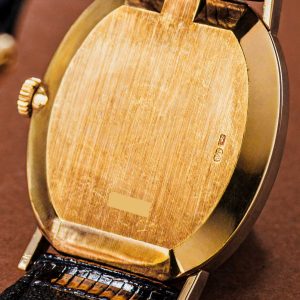 The case: An elegant, oval case crafted from solid 18-karat yellow gold, measuring a modest 33 x 27 mm. The bezel features a delicate engraving that subtly serves as an hour marker, a detail that emphasizes the case’s geometric beauty.