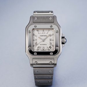 The Brazilian dandy Alberto Santos Dumont inquired with his friend Louis Cartier about a better solution for telling time while flying. His pocket watch was rather cumbersome in flight. Louis Cartier designed a flat, square watch for him in 1904: the Cartier Santos.