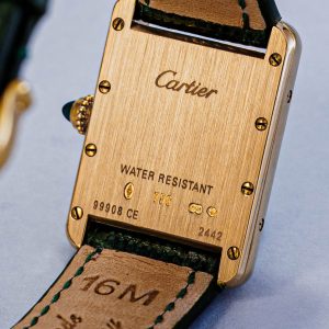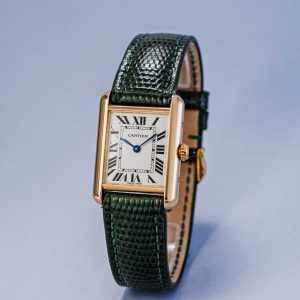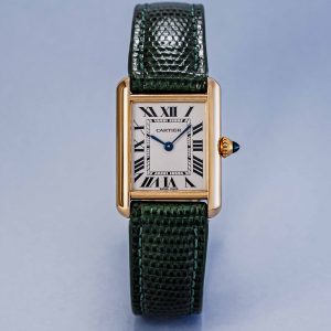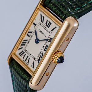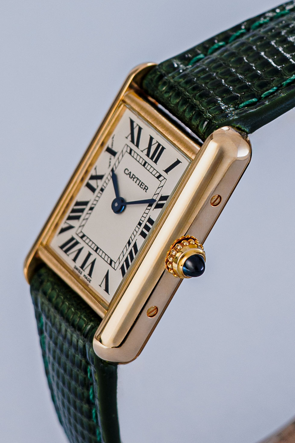 The iconic design looks simple and elegant, but is deceptively complex at the same time. The nearly square case is flanked by two brancards, giving the watch its slender, rectangular appearance. A form that is clearly taken from the Renault tank with its tracks. A white dial, black Roman numerals, heat-blued hands, rail-road track and sapphire cabochon crown complete the typical Tank design.