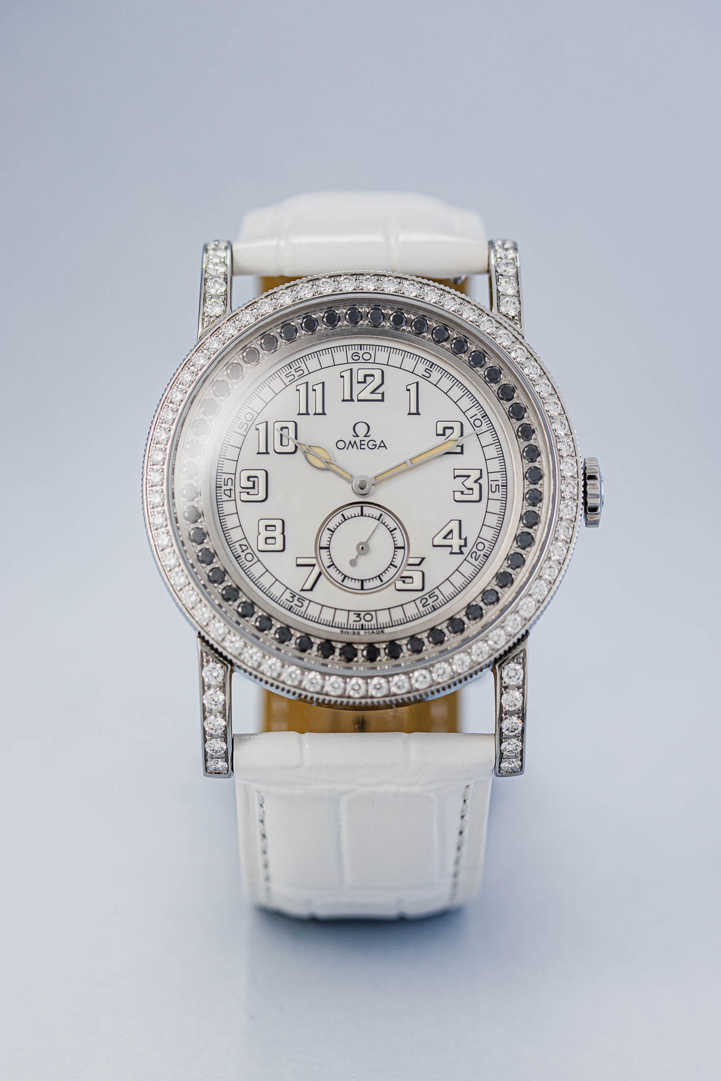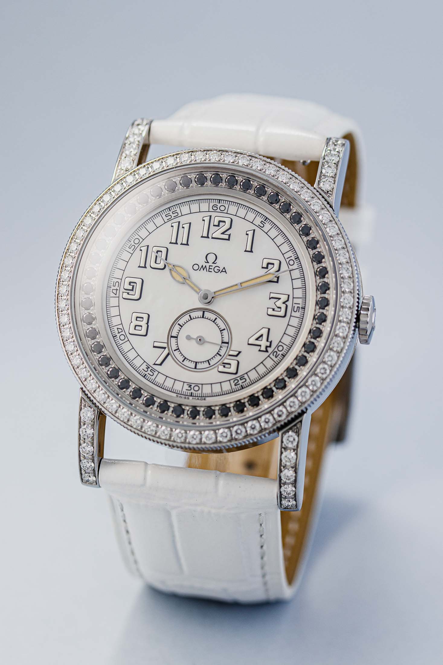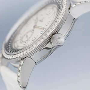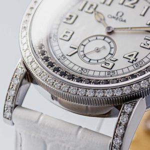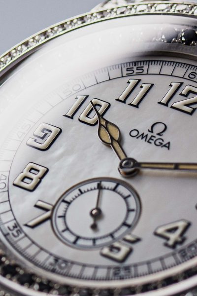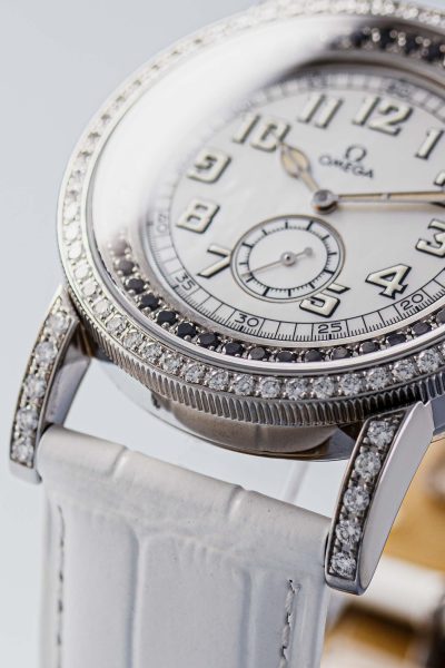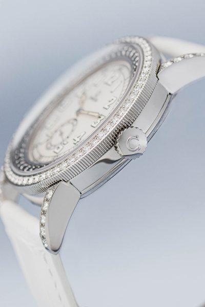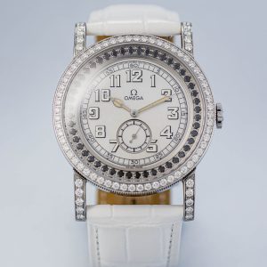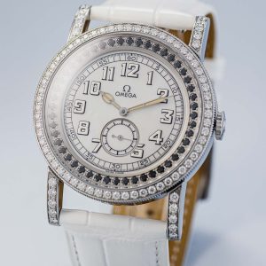 The Aquarella was Omega’s answer to those who wanted serious horology with serious sparkle. This particular example features white diamonds set into the bezel whilst black diamonds accent the edge of the dial, creating a striking contrast against the lustrous mother of pearl centre. The off-white arms complement the overall palette perfectly.