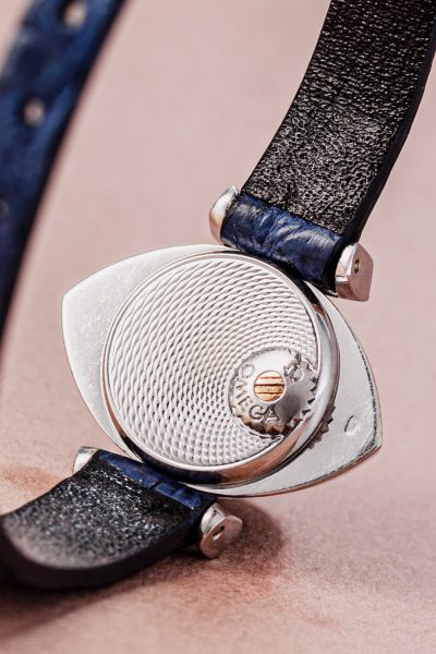 The eye is immediately drawn by the unique shape of the case. This is not an average, round, or square design; the shape is bold and striking, a subtle invitation to admire the watch from all sides.
