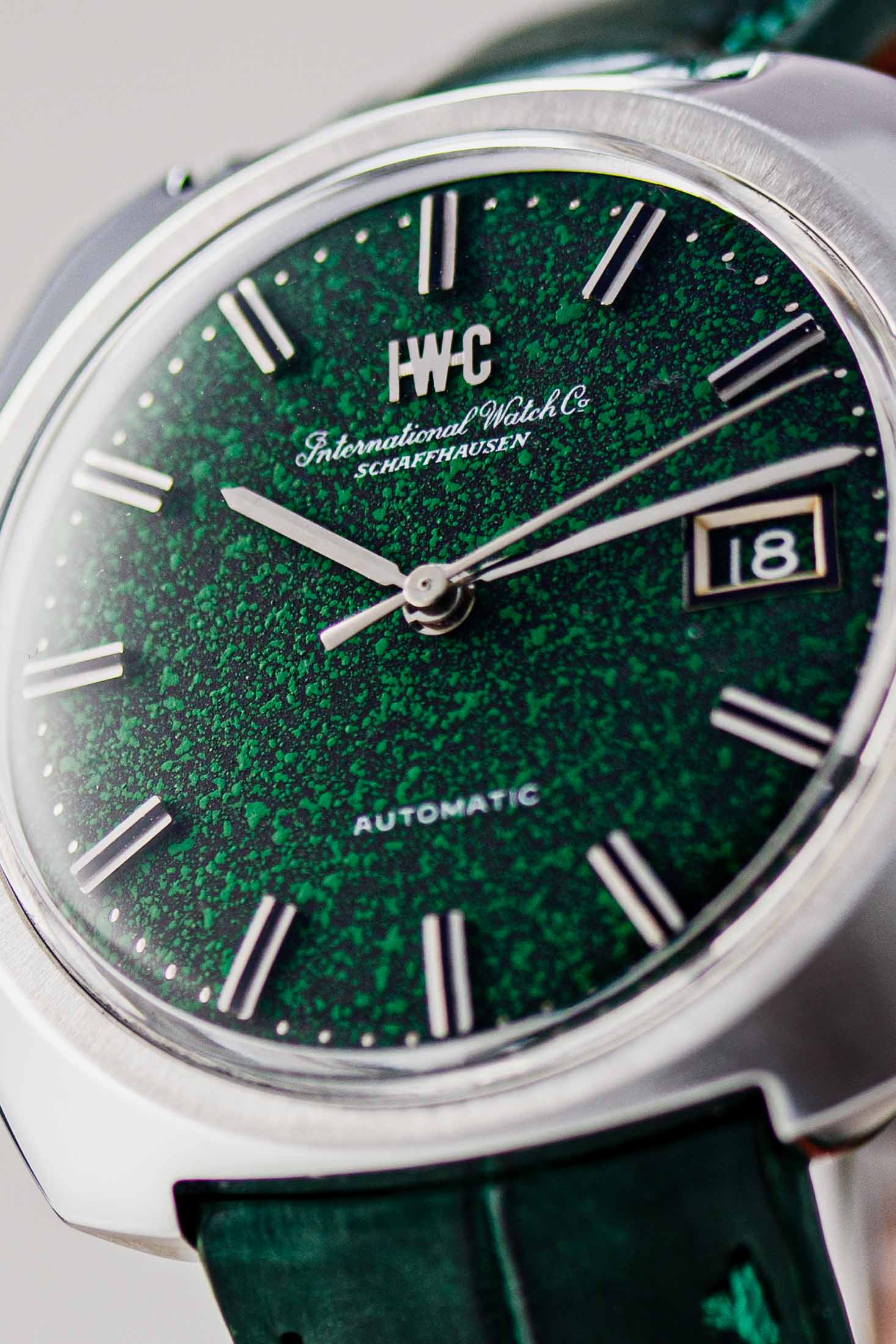 The green marble dial is the highlight of this reference each piece displays its own natural pattern and color variations, ensuring no two watches are alike. Due to its rarity and distinctive look, the Ref. 814 has become an appealing and collectible vintage IWC.