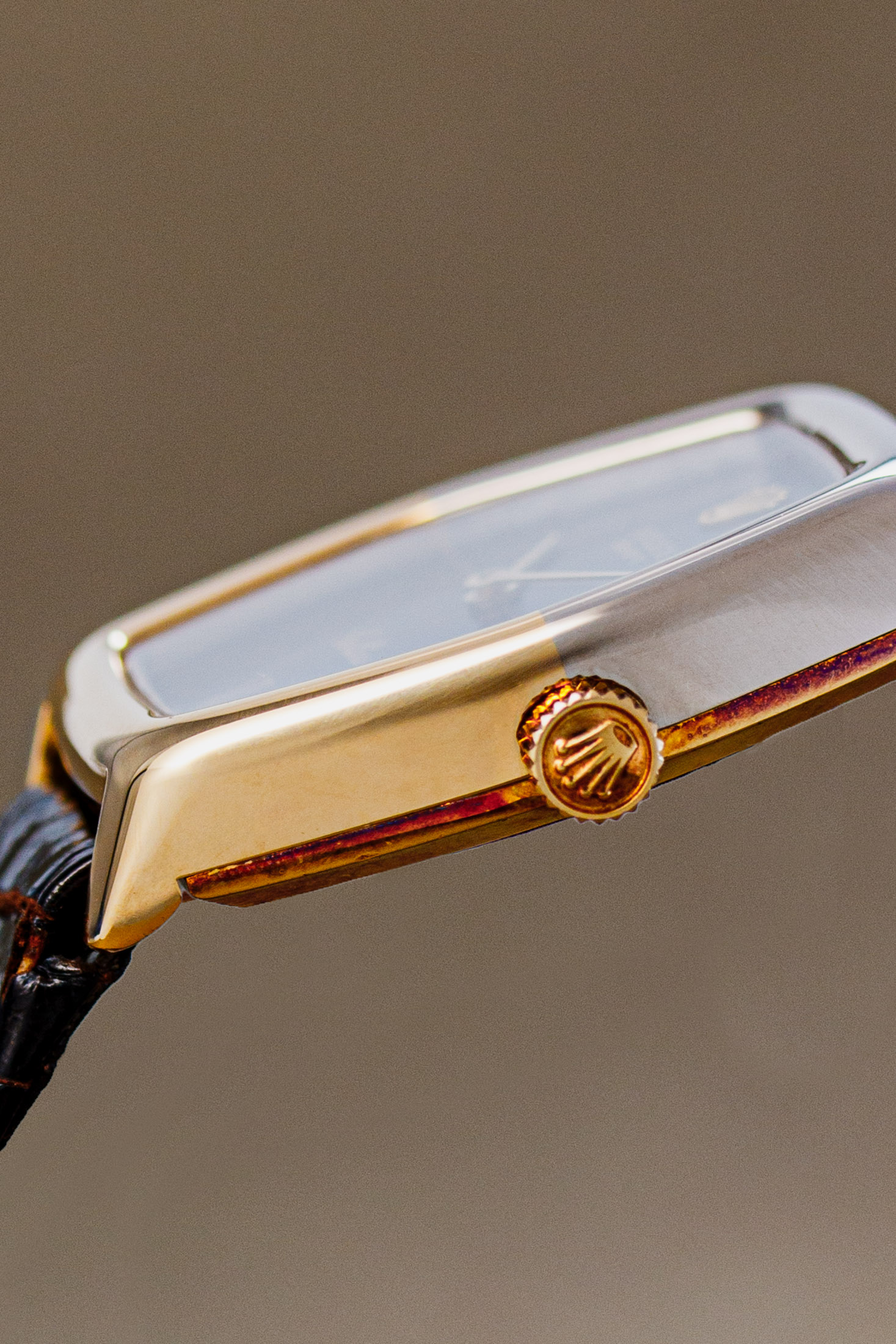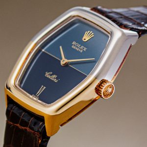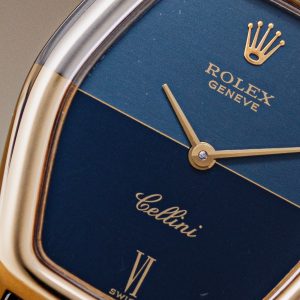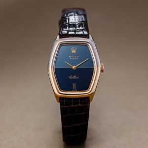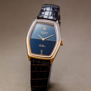 The Rolex Cellini Ref. 4106 from 1975 is a distinctive example of Rolex’s dress watch collection, featuring a two-tone 18k gold case with both white and yellow gold. The design is further emphasized by its two-tone blue dial, split into a dark blue and a lighter blue section, creating a striking contrast and giving the watch a subtle, artistic character.