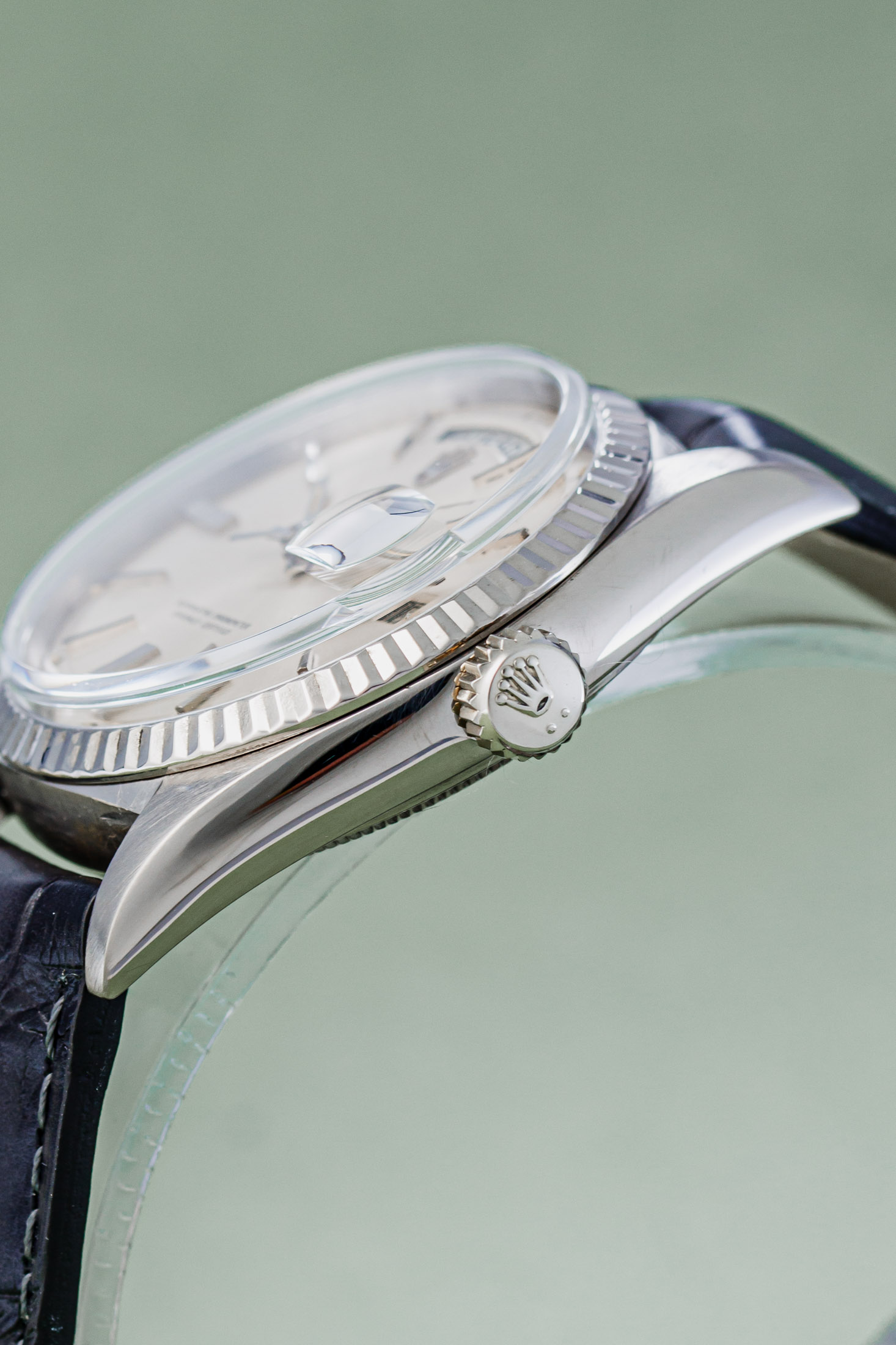 Produced in 1967, this Day-Date features the famous silver “Pie-Pan” dial, a detail instantly recognized by connoisseurs. The name refers to the subtly sloped edge of the dial , reminiscent of a pie dish, which gives the watch remarkable depth and a distinct vintage charm. The 36 mm case is a model of classic proportions, perfectly balanced and effortlessly elegant on the wrist. Inside beats the automatic Caliber 1556, a movement celebrated for its reliability and precision, hallmarks of Rolex’s enduring reputation for technical excellence. The leather strap adds a touch of modern sophistication while preserving the watch’s vintage allure.
