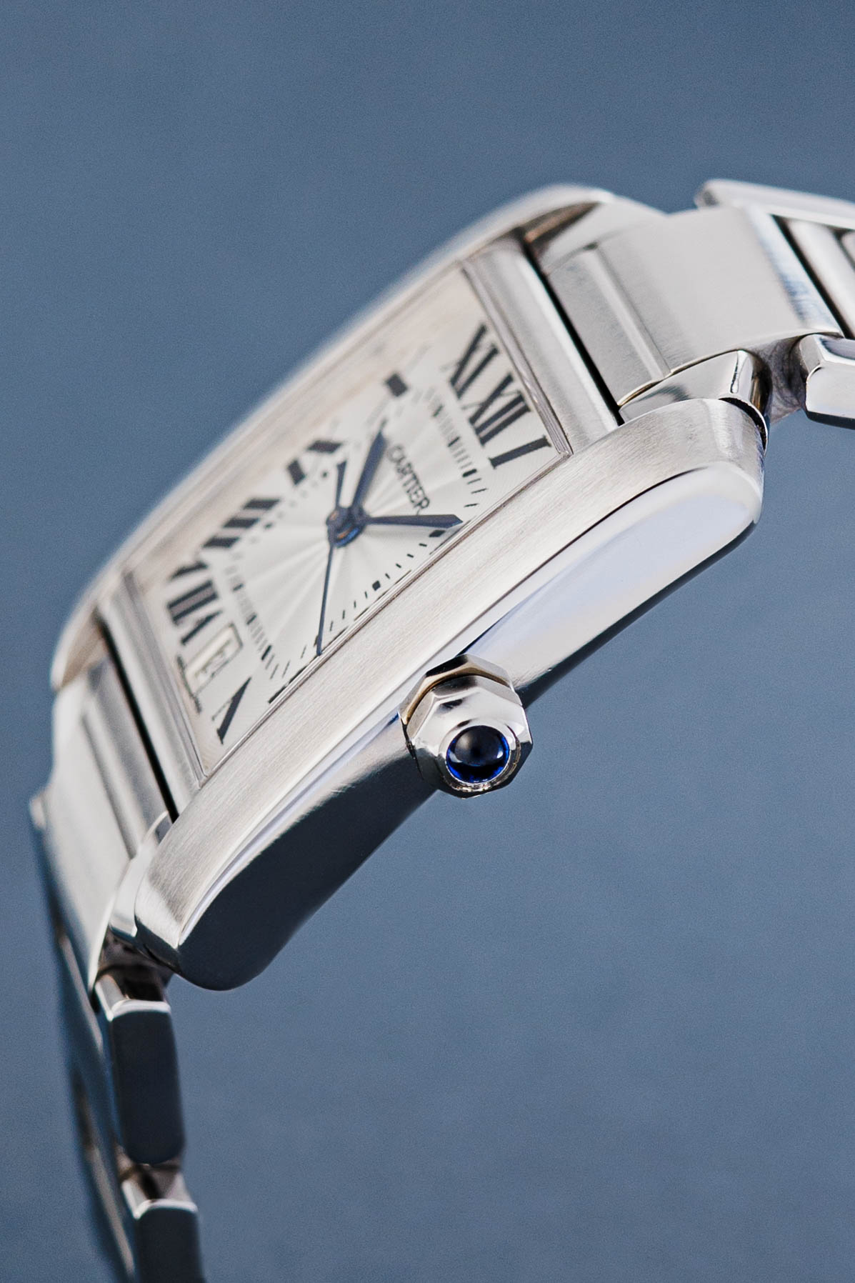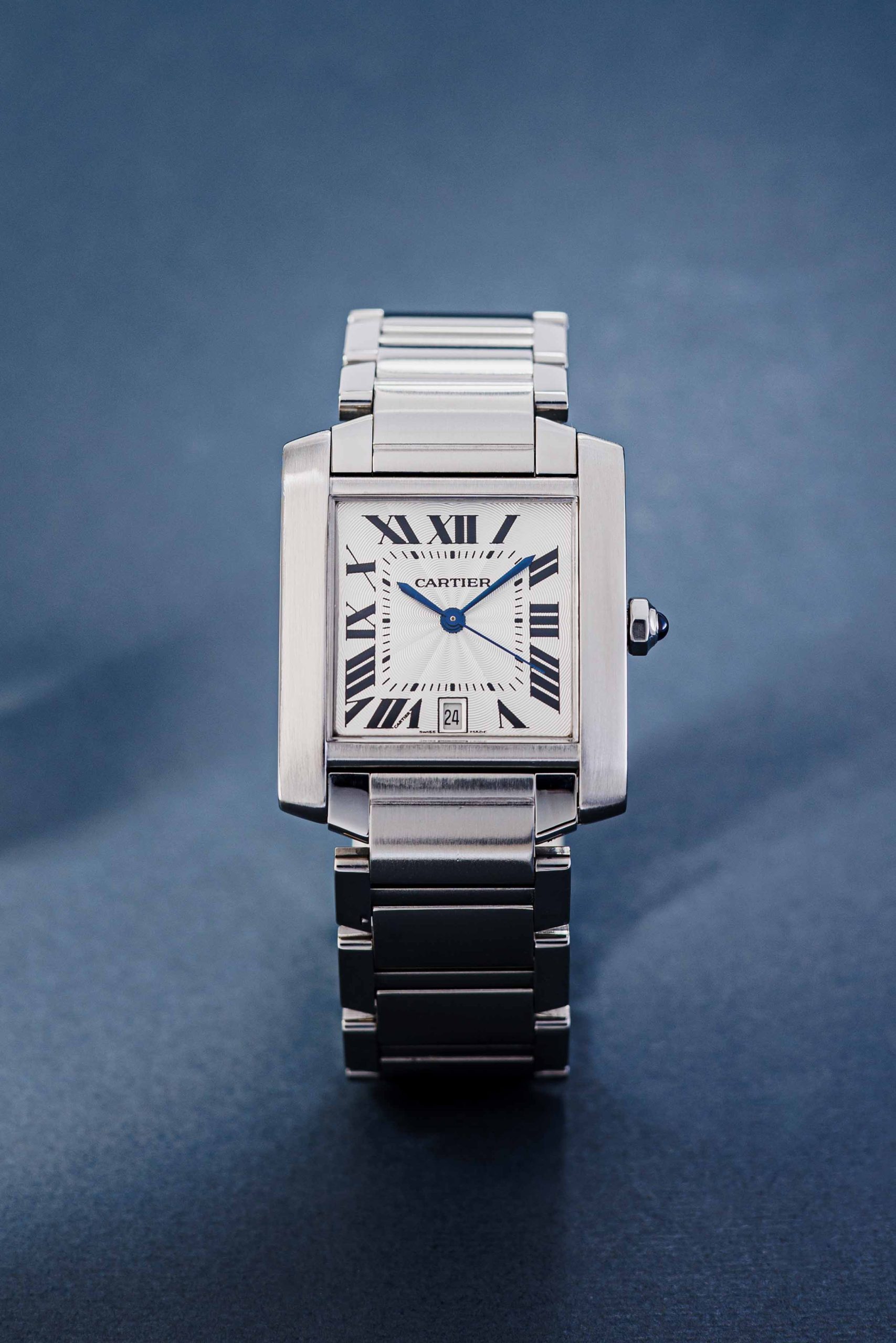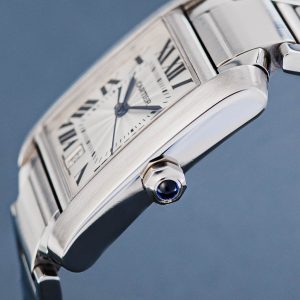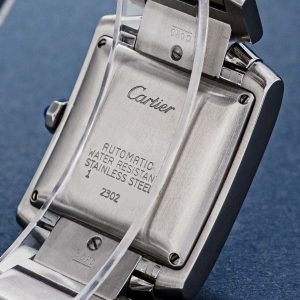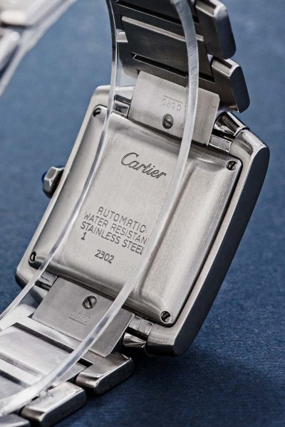 The iconic design looks simple and elegant, but is deceptively complex at the same time. The nearly square case is flanked by two brancards, giving the watch its slender, rectangular appearance. A form that is clearly taken from the Renault tank with its tracks. A white dial, black Roman numerals, heat-blued hands, rail-road track and sapphire cabochon crown complete the typical Tank design.