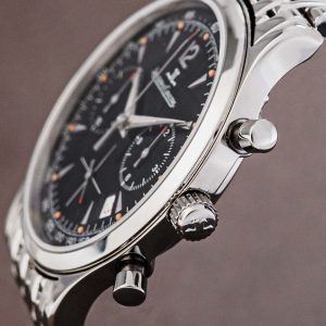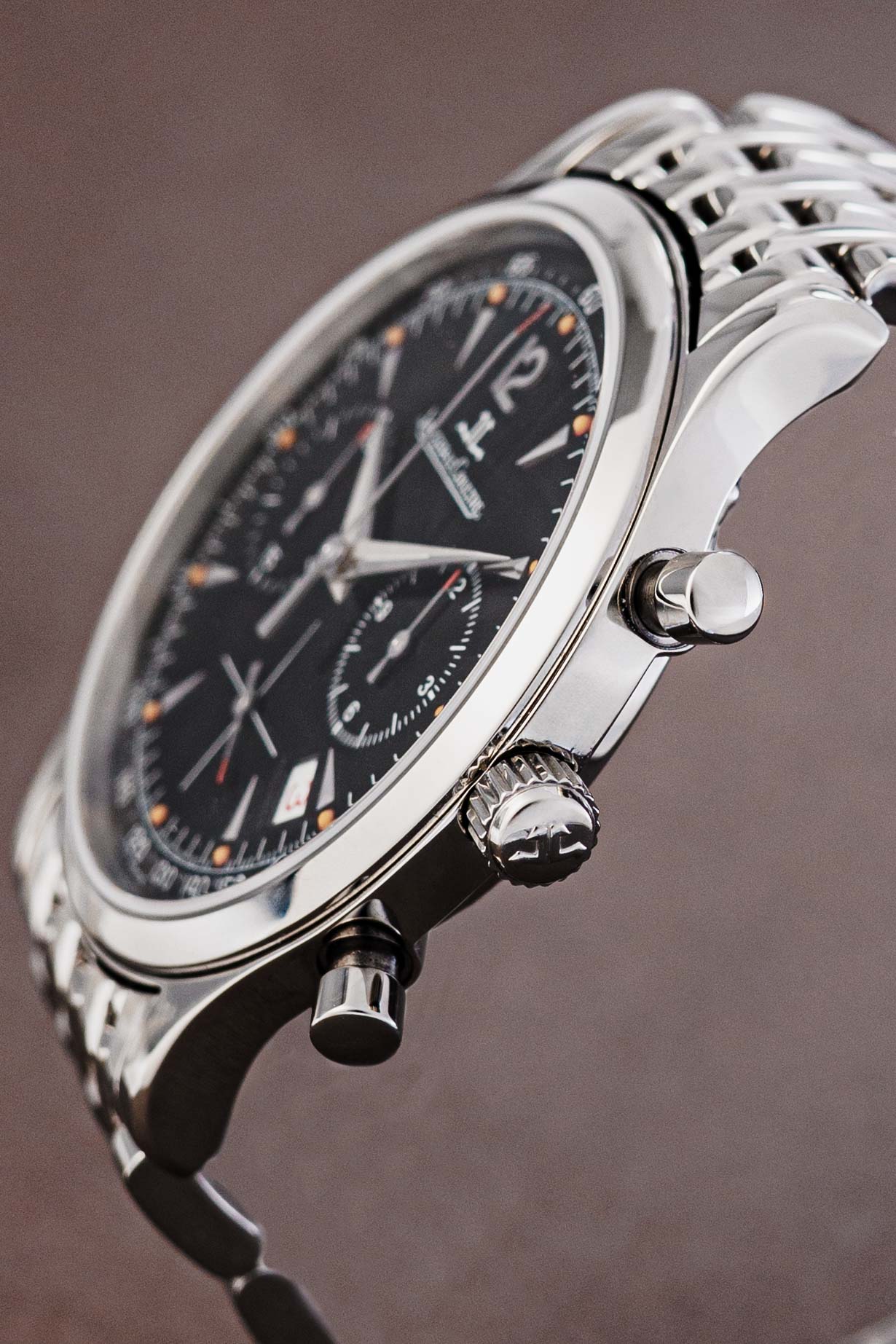The red accents: The red tips of the chronograph hands and the red date display give the watch a sporty sparkle without disrupting its classic balance.