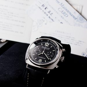 The Panerai Radiomir Chronograph Ref. PAM00288 is a striking watch with a bold 45mm stainless steel cushion case. The black dial features clear Arabic numerals and two chronograph subdials, giving it a sporty yet elegant look.