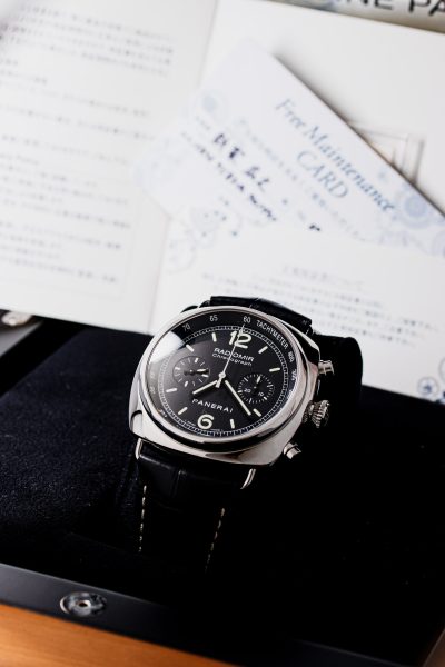 It’s powered by the automatic OP XII movement, based on the ETA Valjoux 7753. A nicely finished crown and pushers complete the classic Radiomir design.