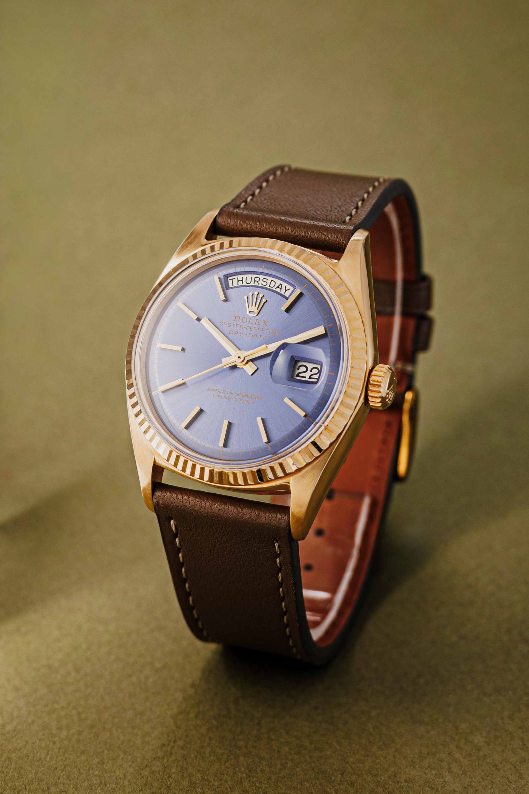 Although commonly referred to as blue, the dial subtly shifts in tone depending on the light, ranging from deep navy to softer blue hues. The baton hour markers reinforce the dial’s symmetry and calmness, complementing the watch’s balanced and composed appearance. Together, these elements create a Day-Date that feels less overt and more quietly confident.