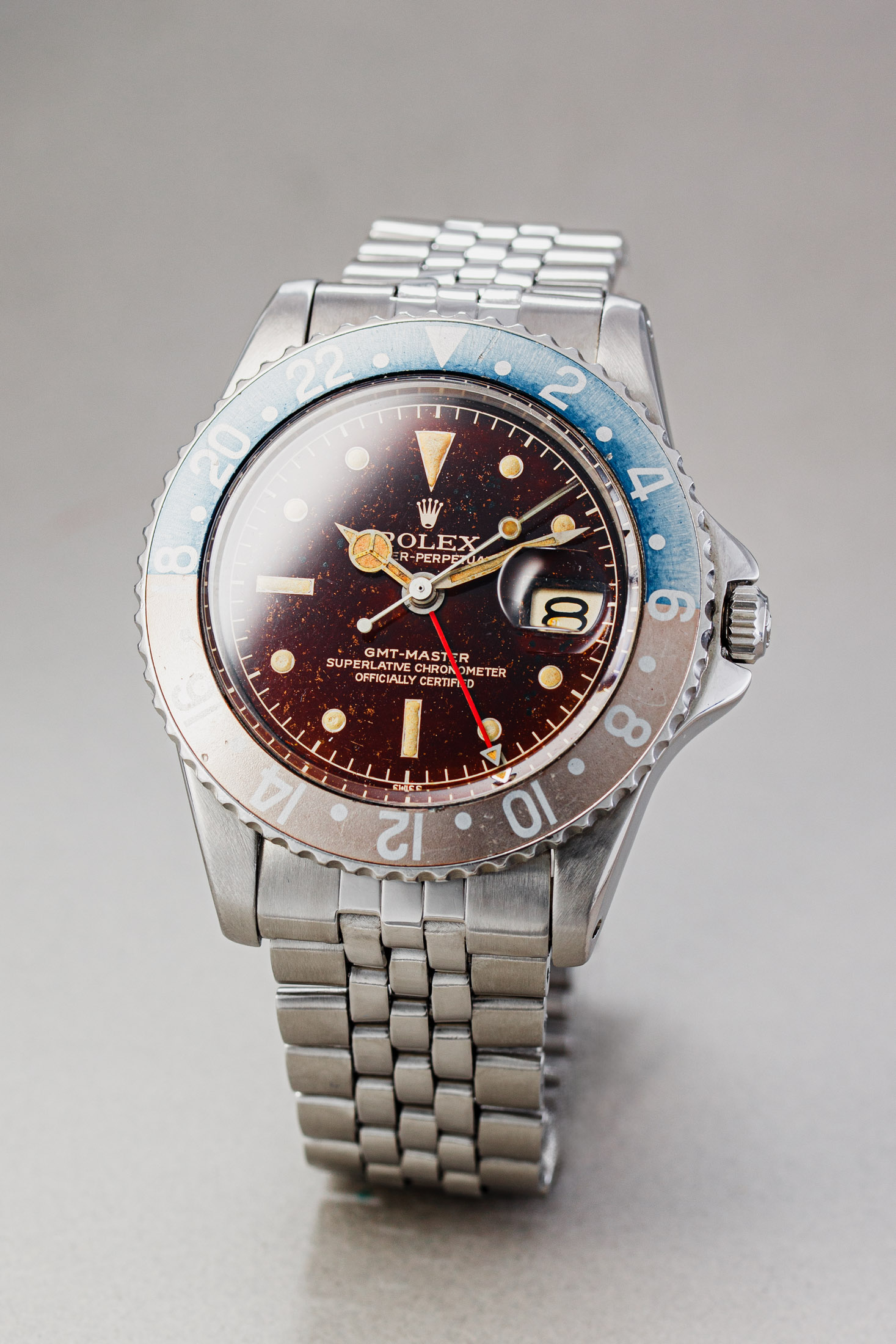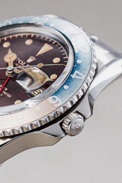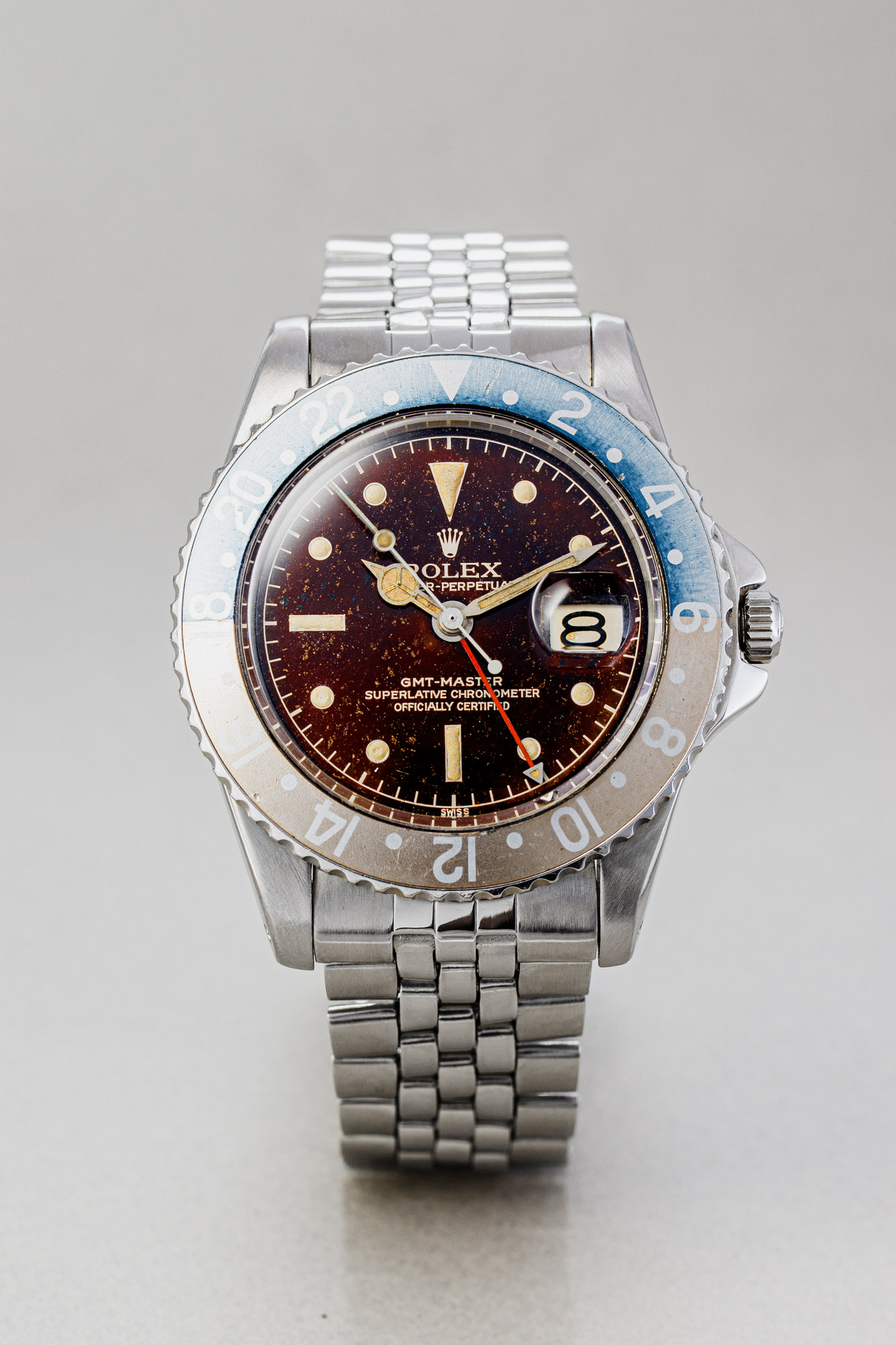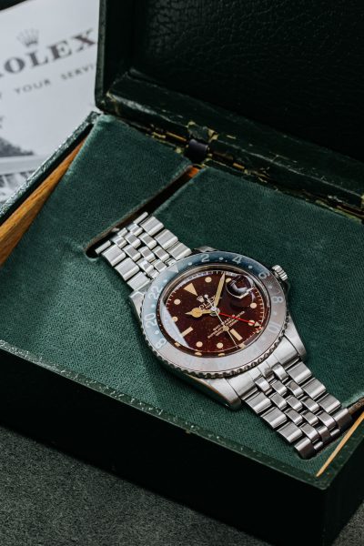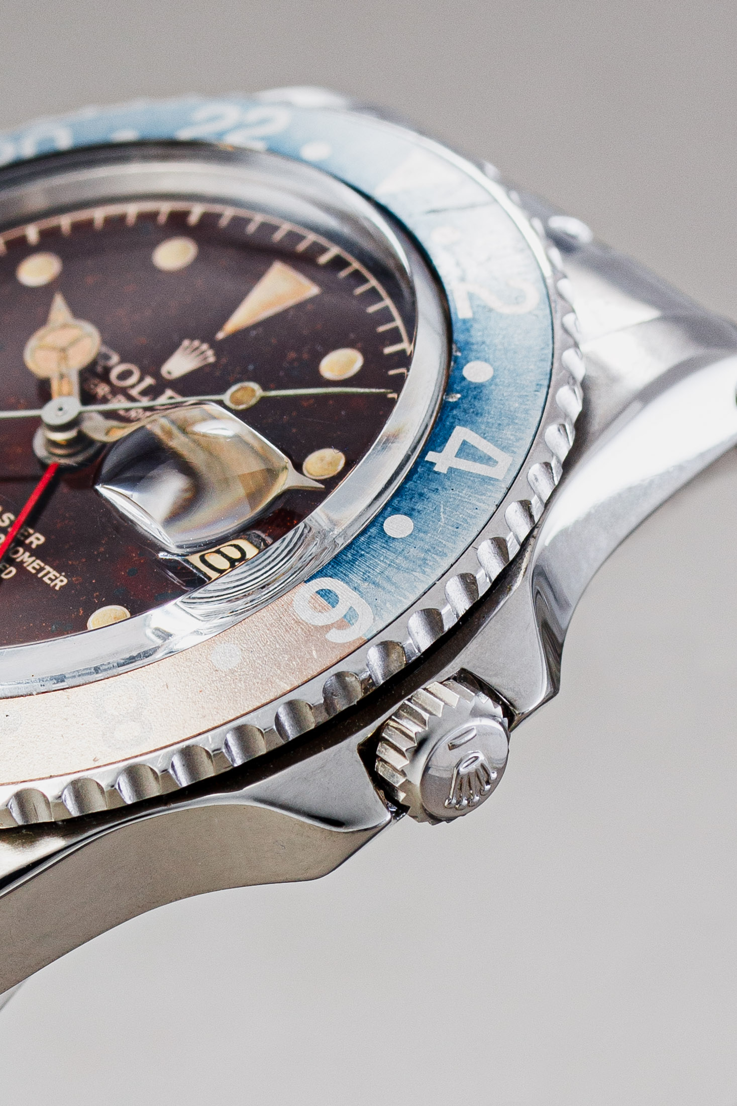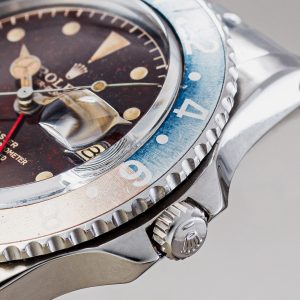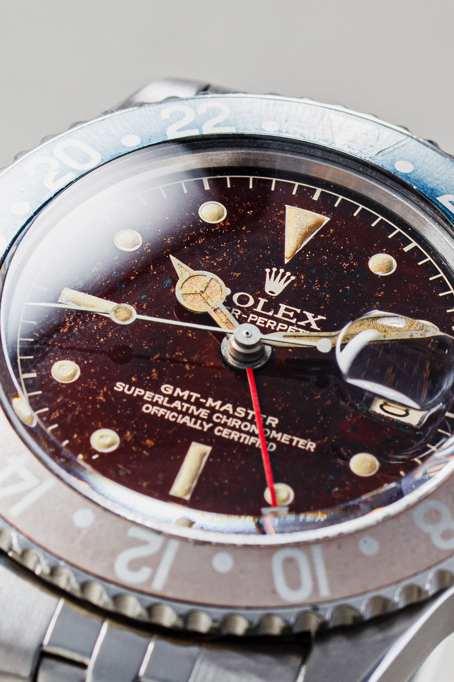 This example from 1960 is an exceptional early GMT-Master. It features a stunning gilt tropical dial the glossy black surface has aged into rich, warm brown tones. The watch retains its original Pepsi bezel insert, now with a gentle, even fade that reflects its decades of history.