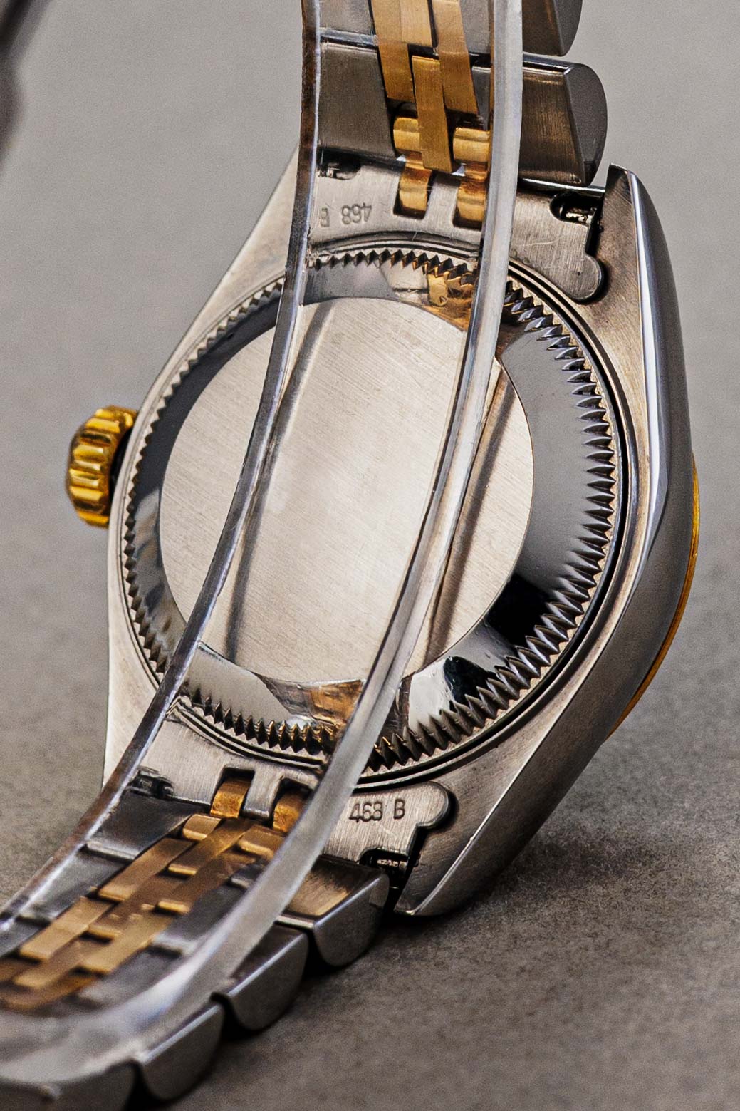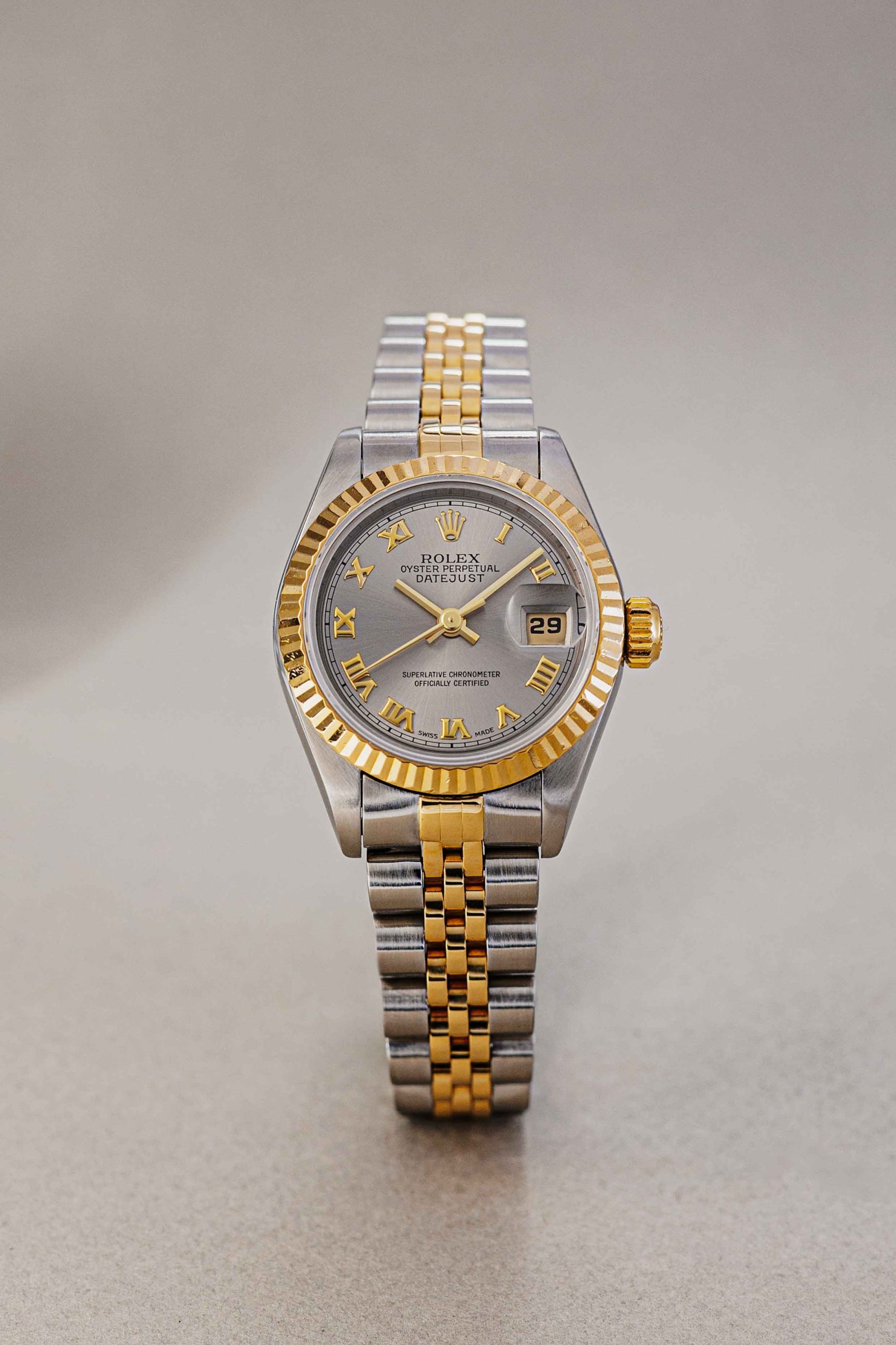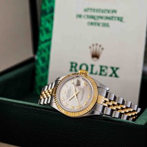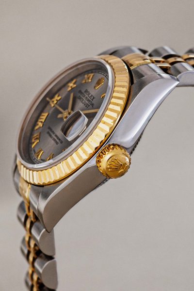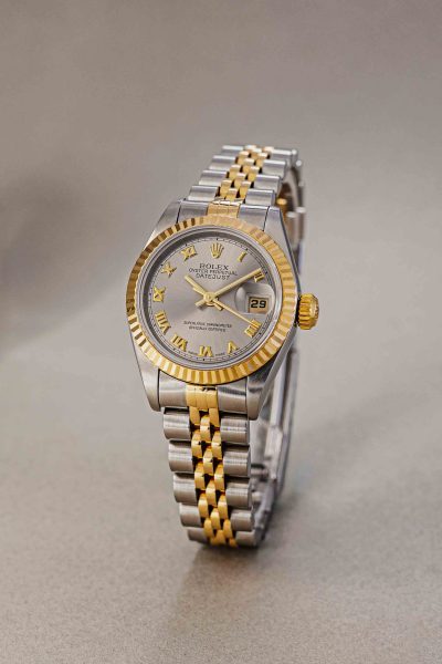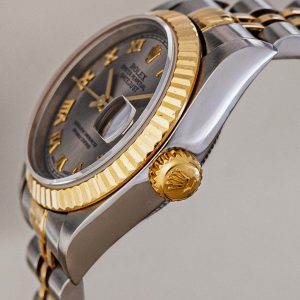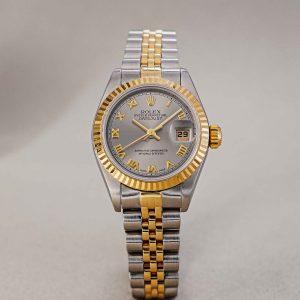 Few watches are as instantly recognizable and universally beloved as the Rolex Lady-Datejust. This particular example from 1997, crafted in the iconic Rolesor combination of 18-karat yellow gold and stainless steel, is a prime example of why this model has set the standard for women’s luxury watches for decades. What immediately sets this piece apart is the rare and stylish gray dial. The subtle sunburst finish beautifully contrasts with the applied gold Roman numerals, giving the watch a classic, almost regal appearance. The distinctive 26mm case features the iconic fluted bezel, which catches the light in a unique way with every movement of the wrist.