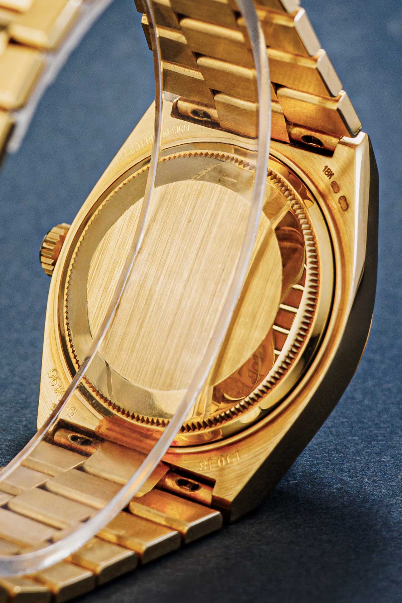 The name Oyster Perpetual refers to two important Rolex technologies present in the watch. Oyster indicates the presence of several water-proofing technologies such as a screw-down crown and a screw-in case back. (Of course, any vintage watch should be treated as not water-resistant). Perpetual refers to a rotor-powered self-winding movement, which will be perpetually wound when worn. The nomenclature is a strong nod to Rolex history, as the Oyster case was patented in 1926 and their perpetual movement in 1931.
