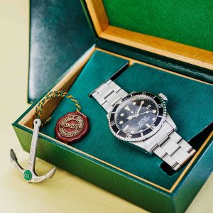 This sporty, iconic watch, with box and papers and anchor, can be admired in one of our display cases. Feel the weight of this robust yet wearable timepiece. And dream away at the thought of what this watch has seen in the depths of the sea.