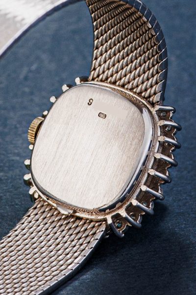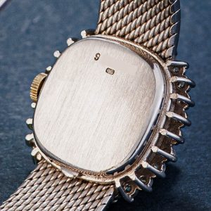 This ladies’ dress watch from the 1960s is truly a piece of art. Let’s start with the case and bracelet: the entire piece is crafted in 18k white gold, featuring a so-called mesh (woven) bracelet. It’s beautifully made, resembling a fine gold bracelet a style often seen in watches from the 1960s and 1970s.