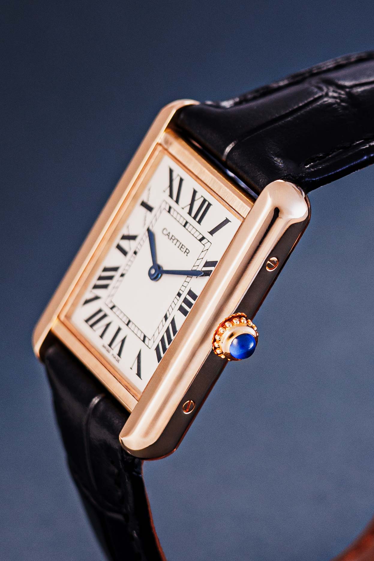 The iconic design looks simple and elegant, but is deceptively complex at the same time. The nearly square case is flanked by two brancards, giving the watch its slender, rectangular appearance. A form that is clearly taken from the Renault tank with its tracks. A white dial, black Roman numerals, heat-blued hands, rail-road track and sapphire cabochon crown complete the typical Tank design.