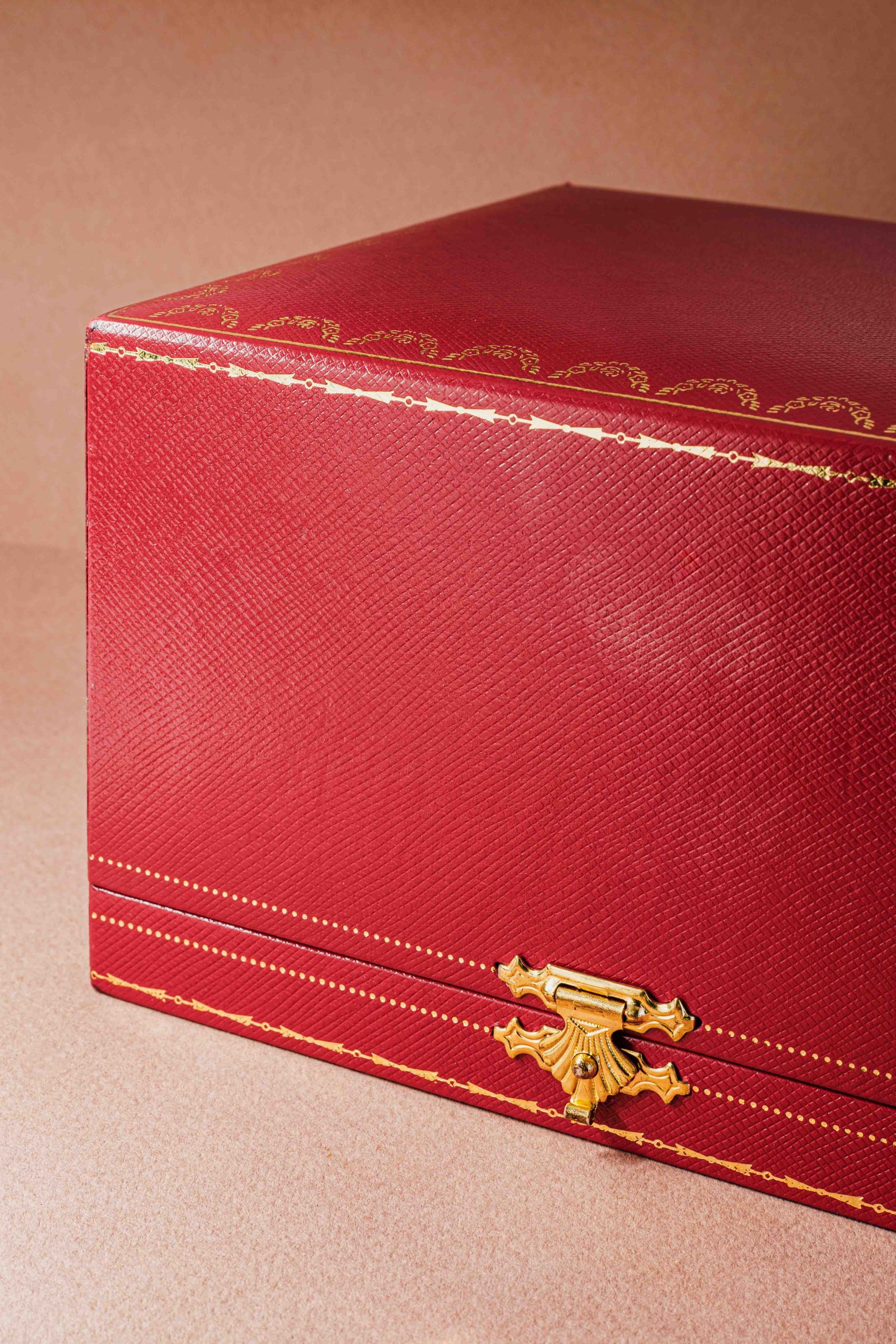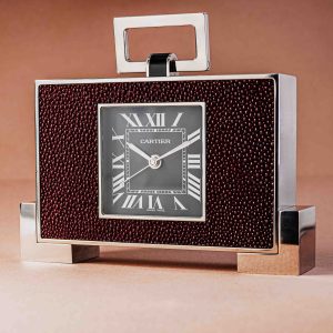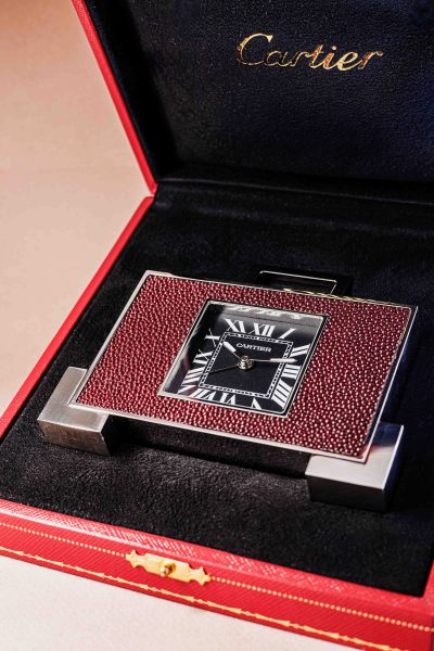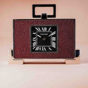 In the already magnificent collection of vintage masterpieces on display at AWCo, we see a new, extremely rare piece from Cartier that blurs the line between timepiece and art object: the Cartier Tank Travel Clock with galuchat (rayskin) finish. This timepiece is set in a silver-colored, rectangular case that follows the iconic lines of the Tank collection. The front is clad in deep red galuchat, a polished rayskin material known for its unique, pearly grain. Cartier began using this exotic material for their most luxurious accessories as early as the Art Deco period, due to the skin’s durability and brilliance. The timepiece features a deep black dial that creates a sharp contrast with the red galuchat bezel. The time is indicated by classic white Roman numerals, an unmistakable Cartier style element. The signature “railway” minute track in the center of the dial ensures clear and elegant readability.