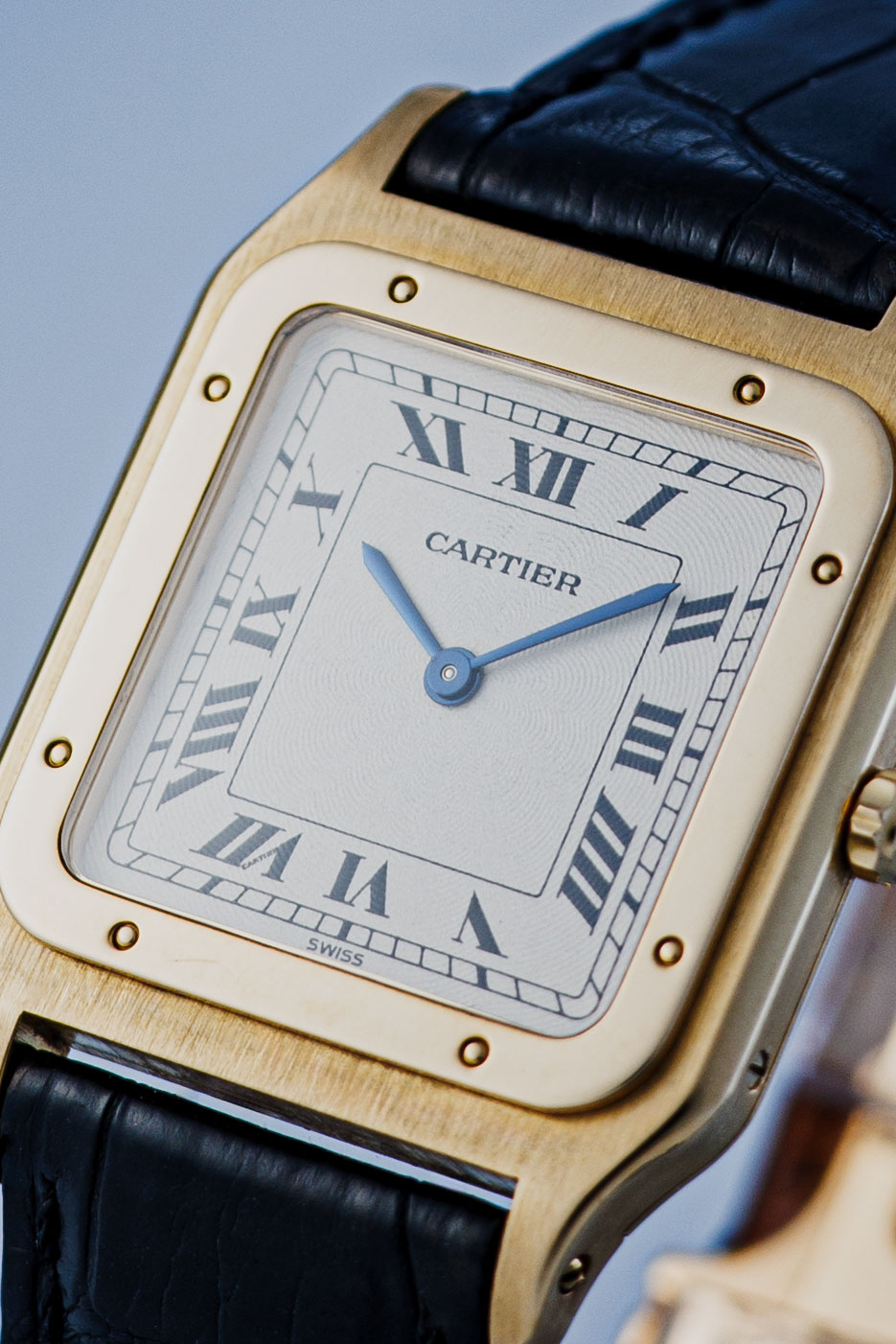 The 1970’s Quartz crisis and Audemars Piguet’s brilliant answer in the Royal Oak, triggered Cartier to morph the Santos into a modern sports watch. A steel version on an integrated steel bracelet was introduced in 1978, the Santos de Cartier. A more rounded, quartz powered Santos Galbée was launched in 1987. Multiple variations on the theme were launched since. If it is the classical look you are after, the Santos Dumont remains most faithful to the very first Santos from 1904.