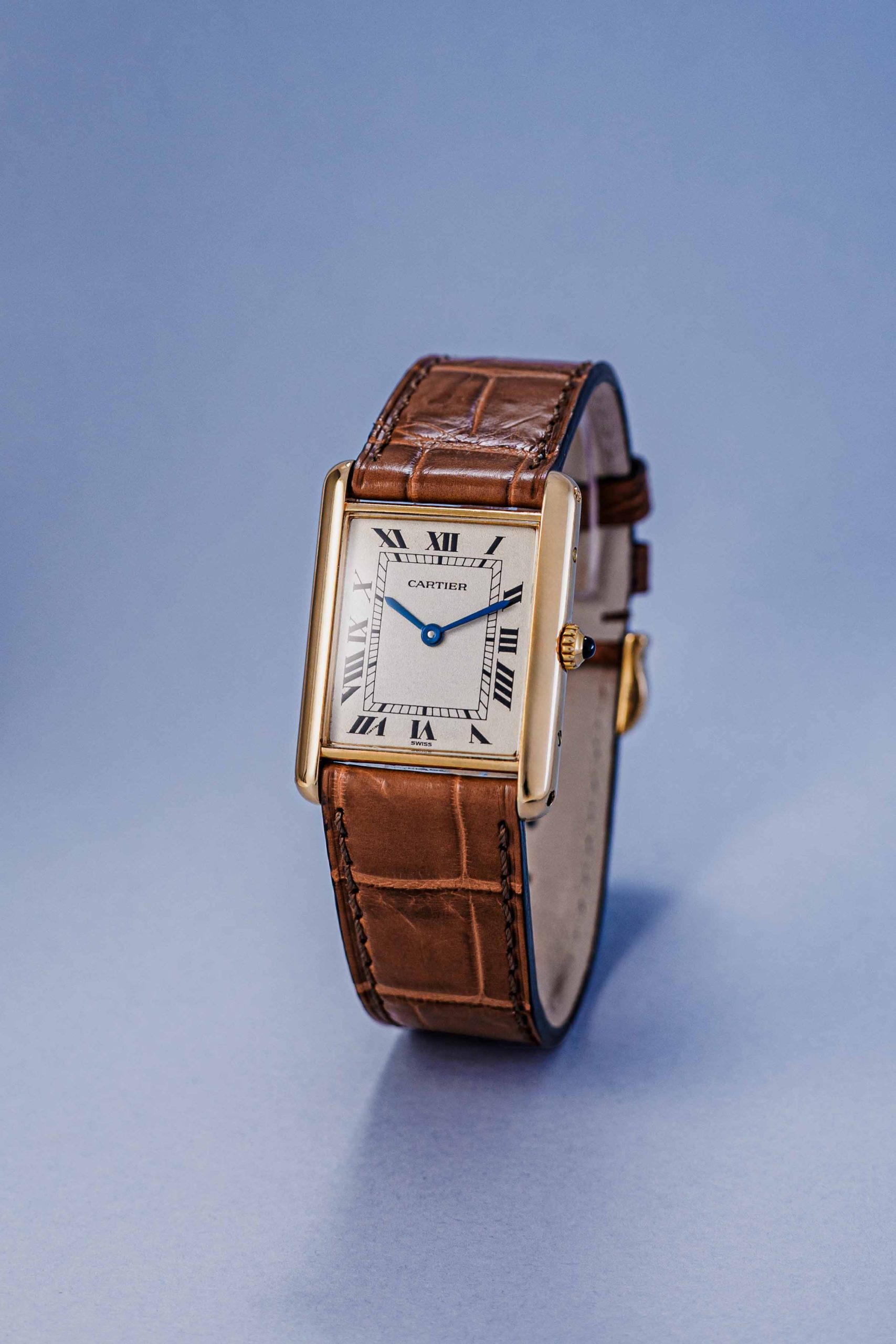The iconic design looks simple and elegant, but is deceptively complex at the same time. The nearly square case is flanked by two brancards, giving the watch its slender, rectangular appearance. A form that is clearly taken from the Renault tank with its tracks. A white dial, black Roman numerals, heat-blued hands, rail-road track and sapphire cabochon crown complete the typical Tank design.