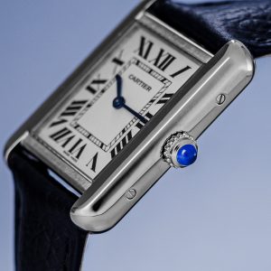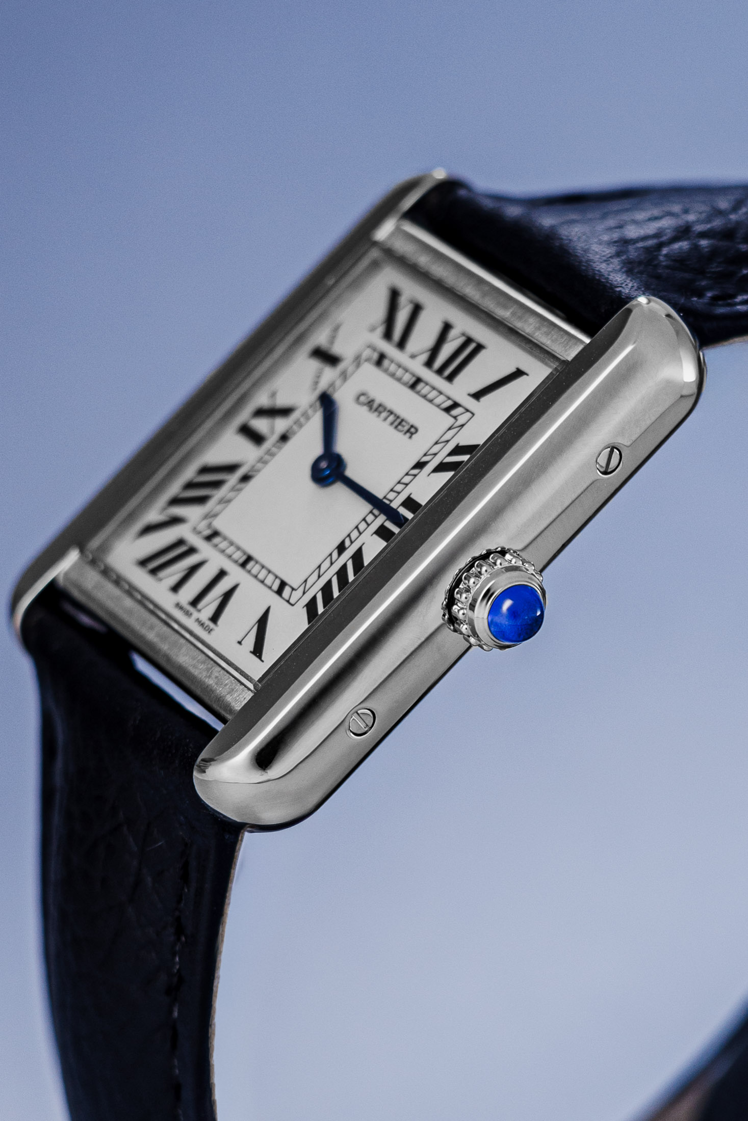 With the characteristic Roman numerals and the blue sapphire cabochon on the crown, you wear an unmistakable piece of Parisian chic on your wrist. The Tank Solo looks just as good with a business blazer as it does with a casual outfit. It is the ultimate expression of subtle taste and sophistication.