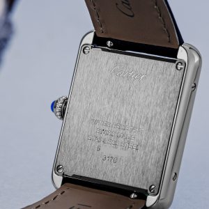 The iconic design looks simple and elegant, but is deceptively complex at the same time. The nearly square case is flanked by two brancards, giving the watch its slender, rectangular appearance. A form that is clearly taken from the Renault tank with its tracks. A white dial, black Roman numerals, heat-blued hands, rail-road track and sapphire cabochon crown complete the typical Tank design.