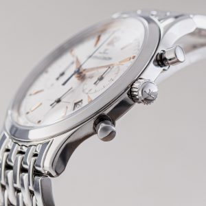 The Jaeger-LeCoultre Master Chronograph Ref. 145.8.31, dating from 1997, is a sporty yet refined timepiece that perfectly embodies the versatility of this prestigious Swiss watchmaker. Crafted in stainless steel and housed in an elegant 34 mm case, it strikes a perfect balance between strength and subtlety, making it ideally suited for both men and unisex wear. The silver-toned dial exudes understated sophistication, featuring crisp hour markers, elegant hands, and a practical date window between 4 and 5 o’clock. Two chronograph pushers and a smooth bezel emphasize its sporty spirit, while the clean steel case ensures a timeless aesthetic.