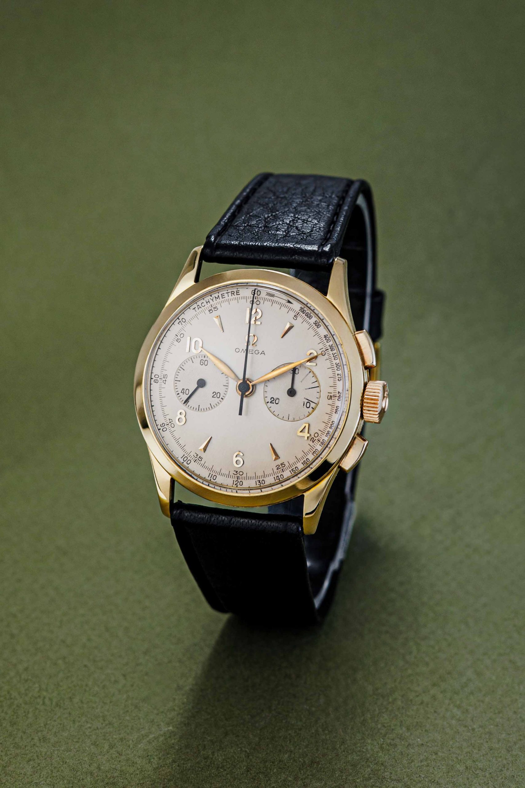 Here we have a beautiful Omega Chronograph in solid 18k yellow gold, dating back to 1958.