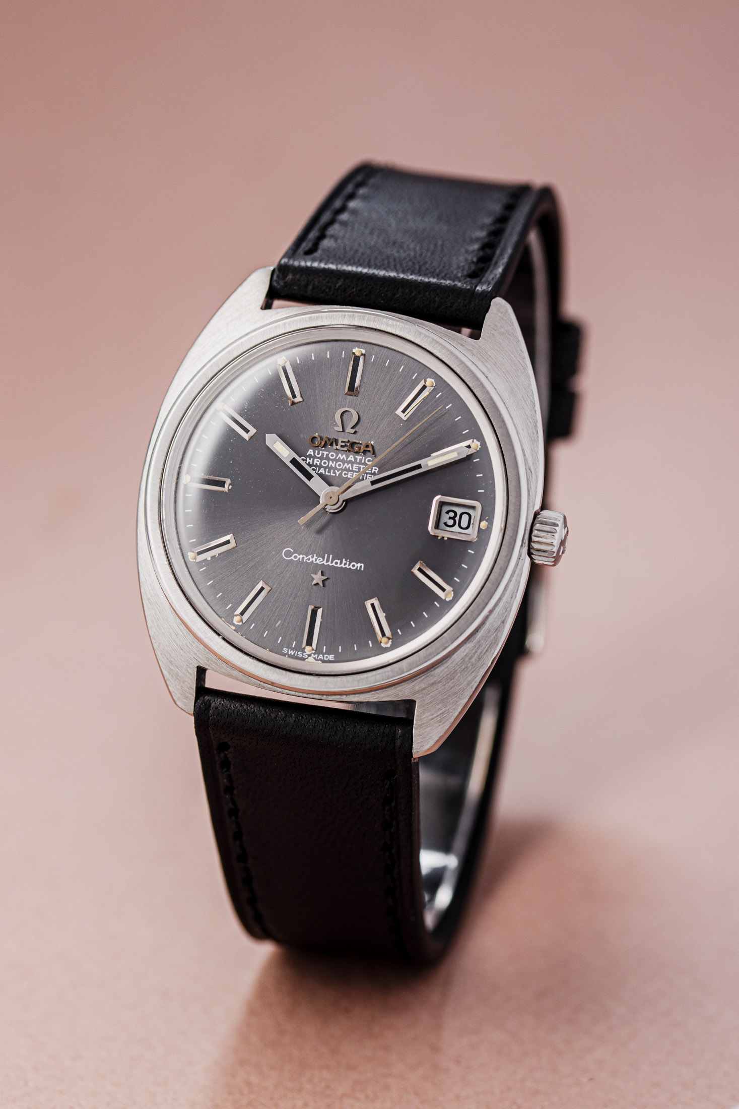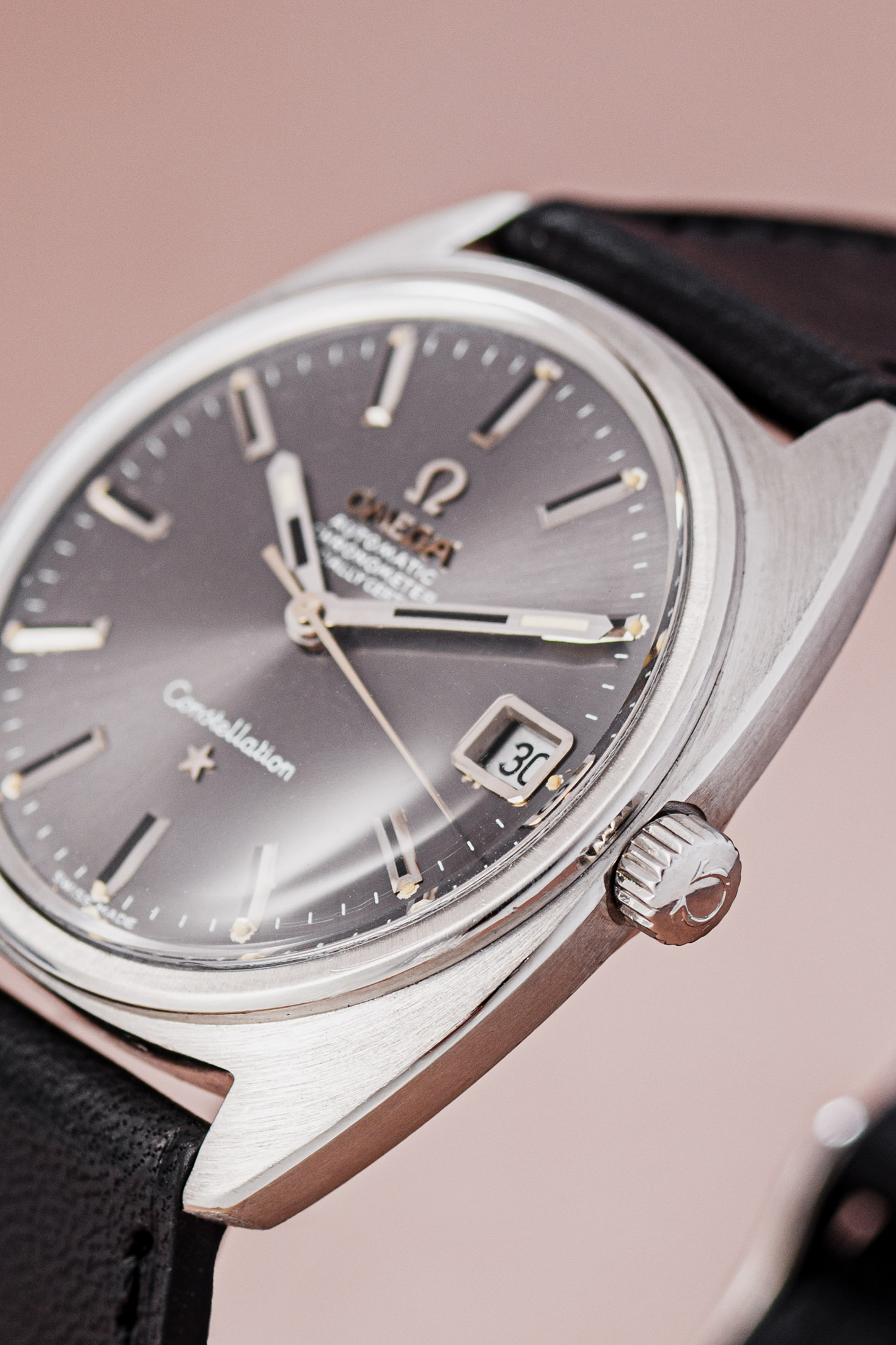 The earlier models from the 1950’s and 1960’s featured the iconic pie-pan dial. The dial would slope down at an angle around its outer perimeter, providing a very cool sense of dimensionality. Since the look is reminiscent of the underside of a pie-pan, a nickname was quickly born. Halfway through the sixties, flat-dial versions slowly took over. The pie-pan remains a highly sought-after Constellation variant today.