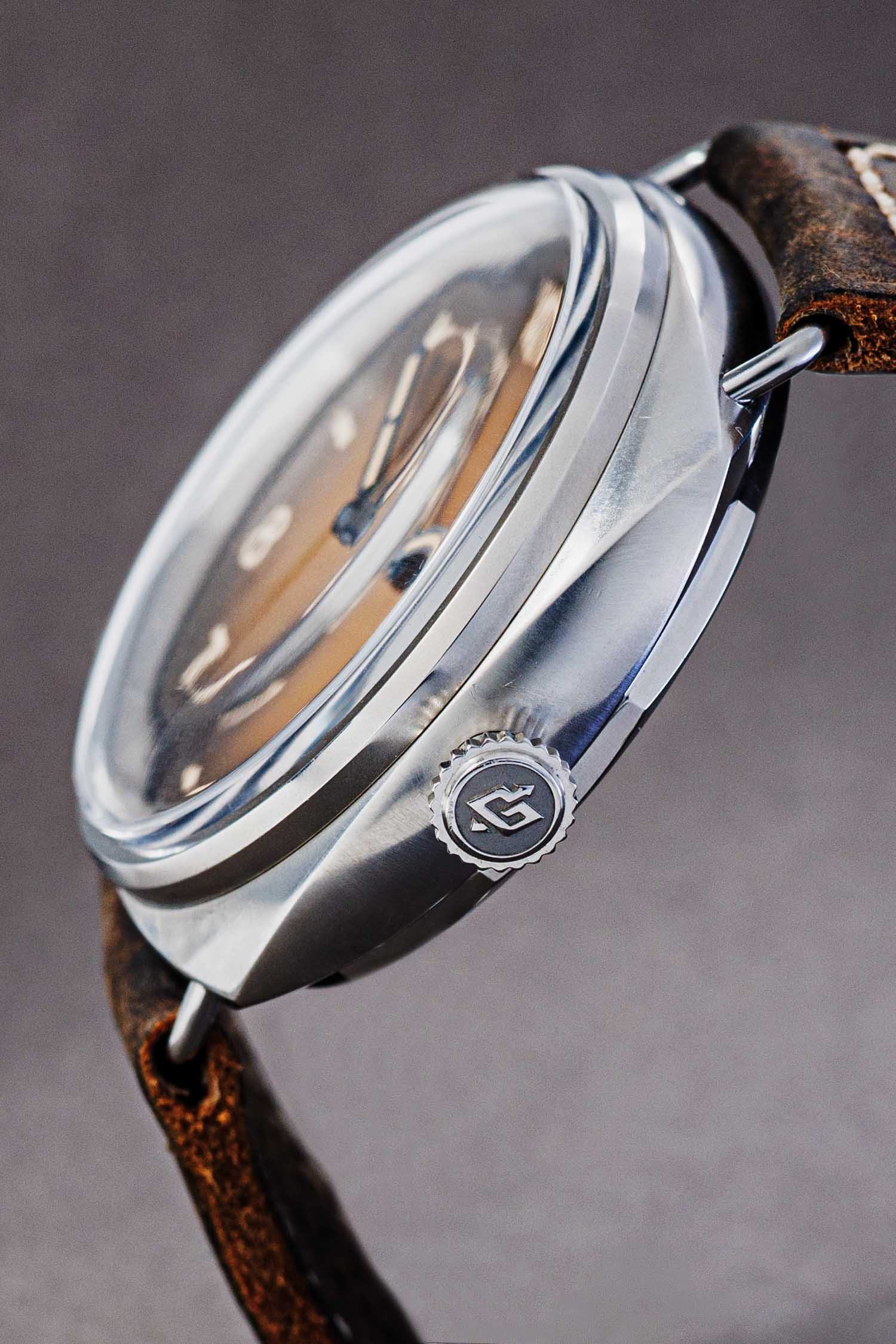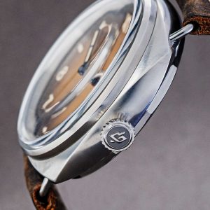 The dial has been deliberately given a tropical brown tone, creating a beautiful vintage heritage look. There is clearly no branding on the dial only the hour markers speak, just as they did in the past. It is a vintage classic, presented in a new and robust form.