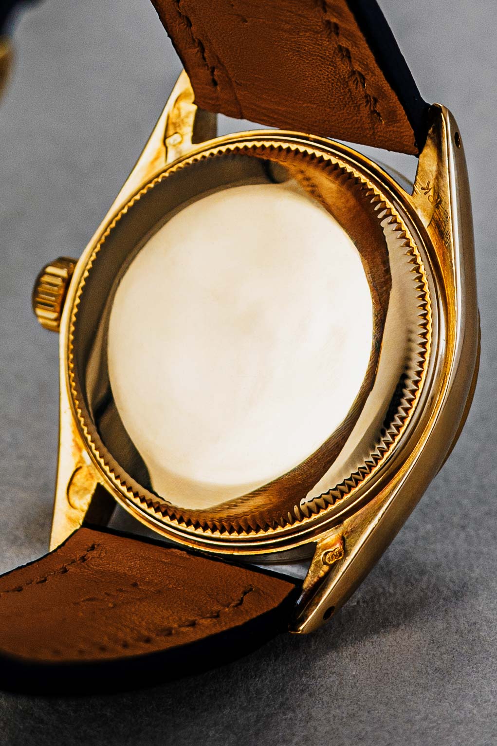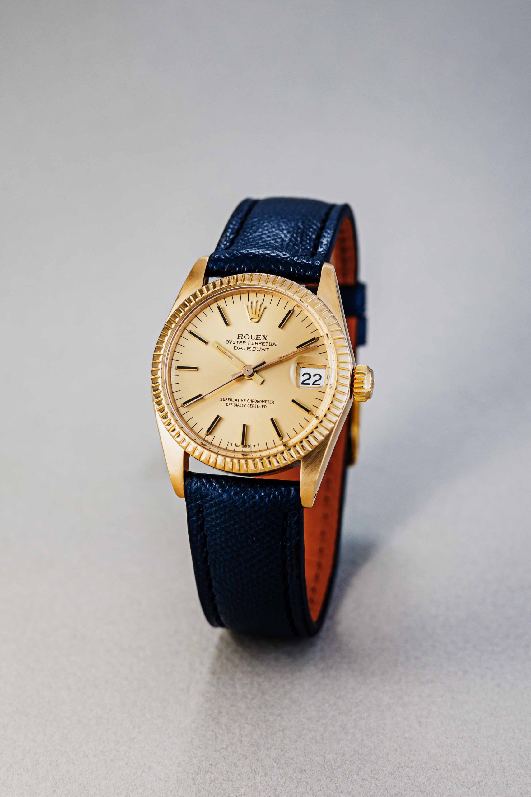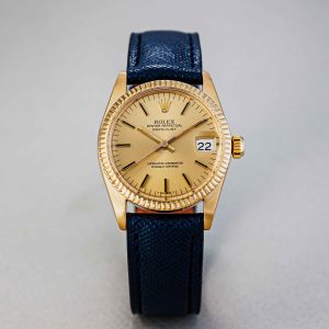 The golden luster: The 18k yellow gold case and bezel make this a timeless and elegant piece, currently presented on a stylish leather strap that beautifully accentuates the gold radiance.