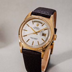 The Day-Date is available in yellow gold, white gold, rose gold and platinum. Countless dial variations include wood, stone and Stella options. Among the many case/bracelet finishes available, the bark is probably best known, resembling the irregular pattern of tree bark. The Day-Date is one of the few Rolex lines with factory gem-set bezels and dials as an option.