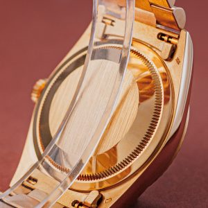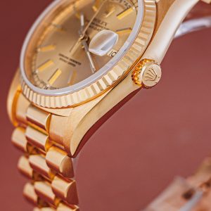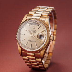A yellow-gold Day-Date hardly needs an introduction. This particular example hails from 1991 and features the sought-after champagne dial paired with tritium lume something we love as vintage watch enthusiasts. It’s powered by the double-quickset caliber and fitted with a sapphire crystal, making it ready for everyday wear despite its elegance.