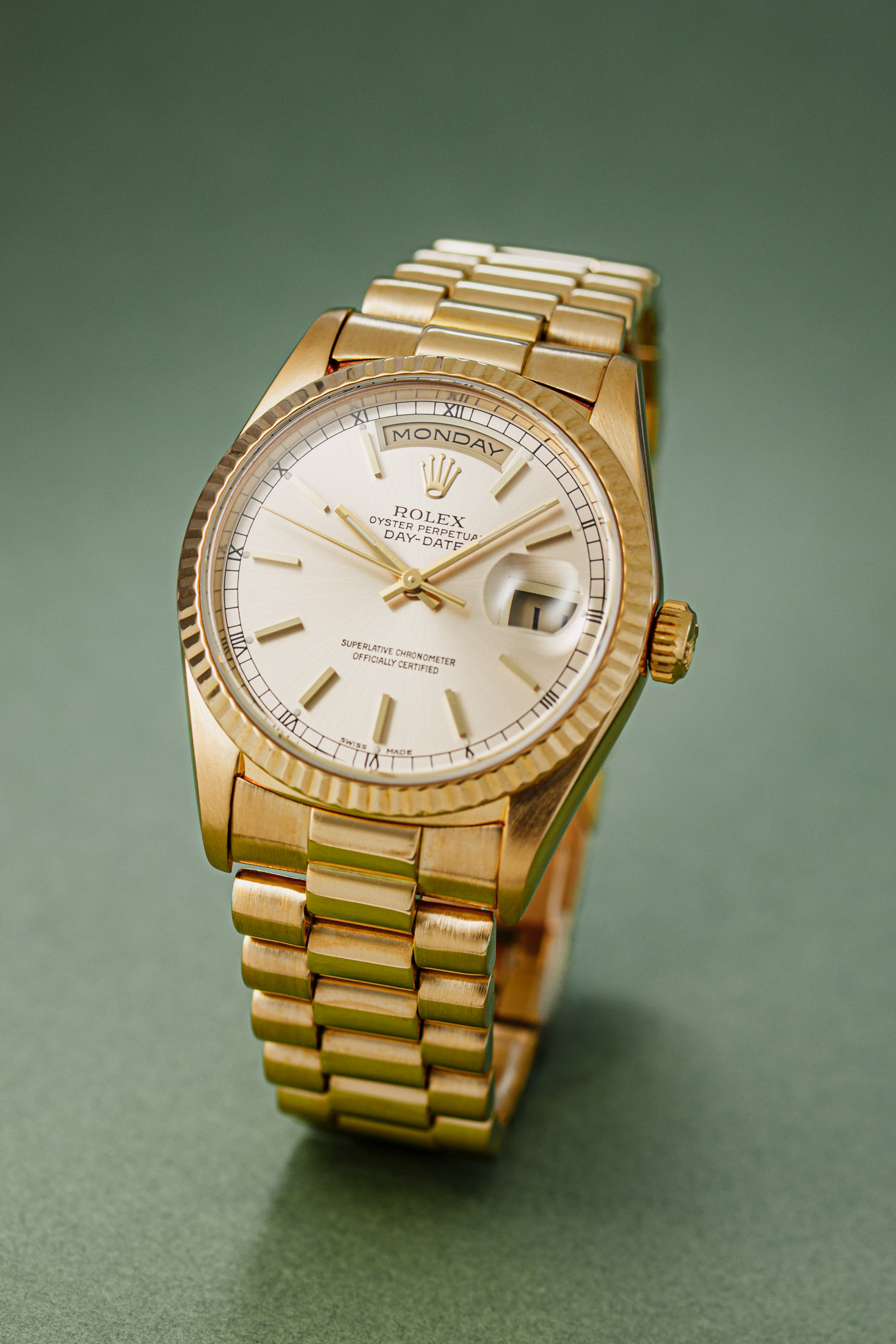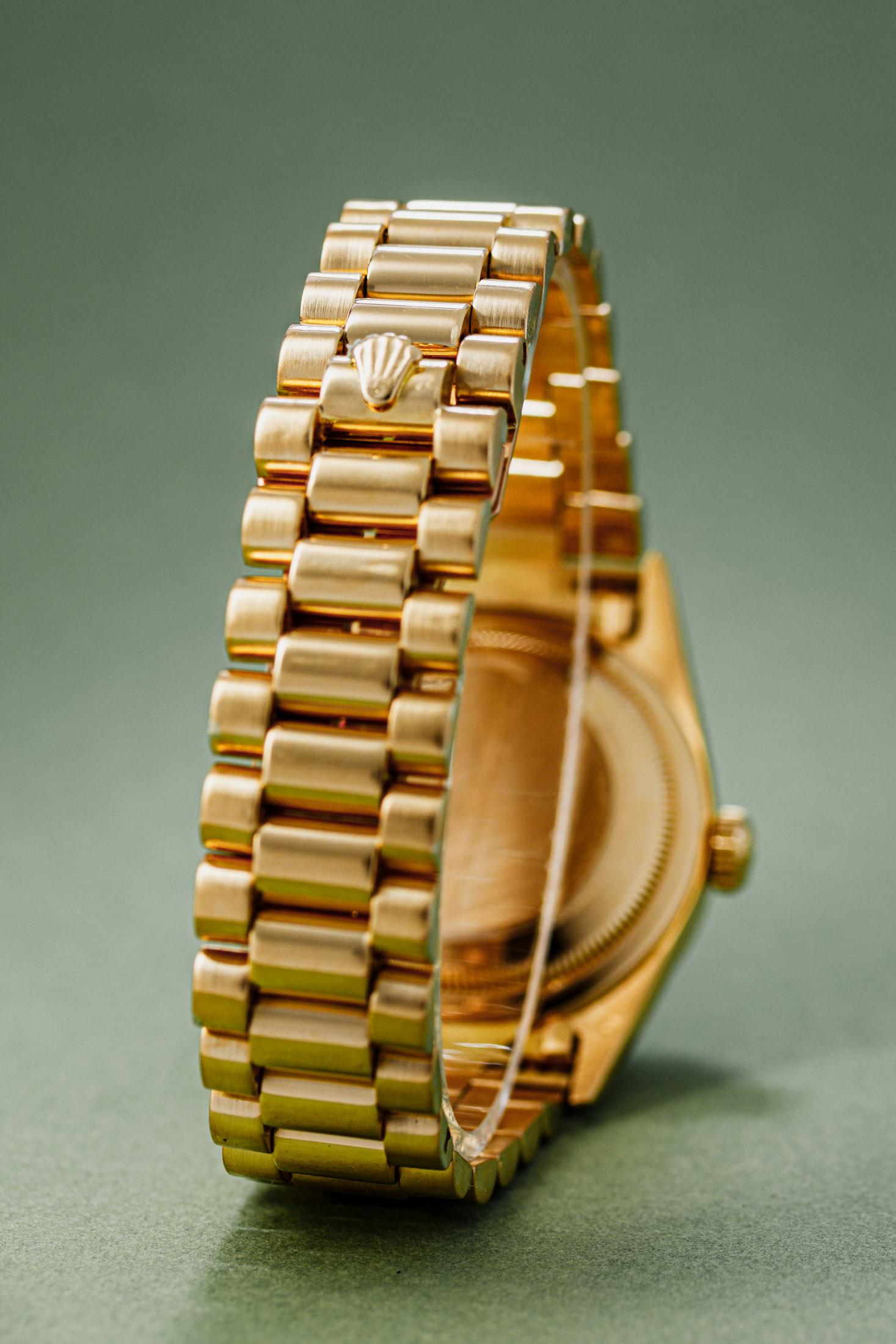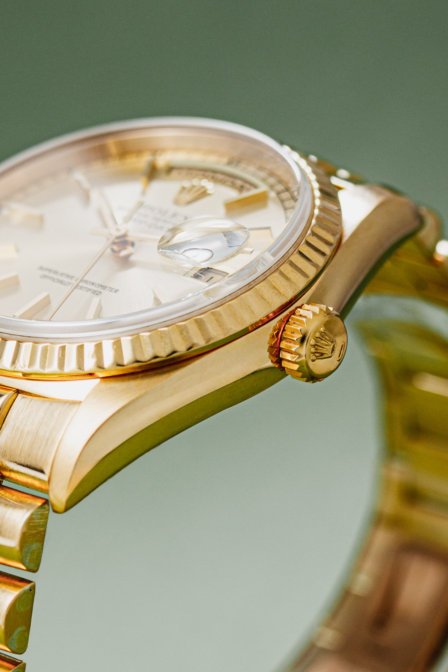 Imagine this as the gift under the tree: an unforgettable surprise for the upcoming Christmas holidays. The warm radiance of the gold reflects the cosiness you will experience in our welcoming AWCo store, where the love for timepieces is paramount. This watch represents a timeless value that perfectly fits the tradition of giving. It is a legacy of quality, destined to shine for many generations to come. The light that falls upon the fluted bezel creates a warm welcome, much like the atmosphere in our shop. There may be no perfect watch, but this Day-Date comes very close with its ageless allure.